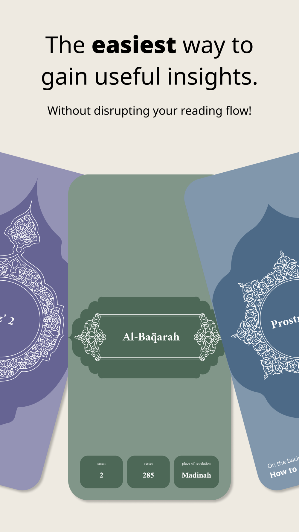 By reading one ayah at a time, you can limit distractions and stay focused on the words in front of you. Flip each ayah card to read its tafsir and fill any gaps in your understanding.