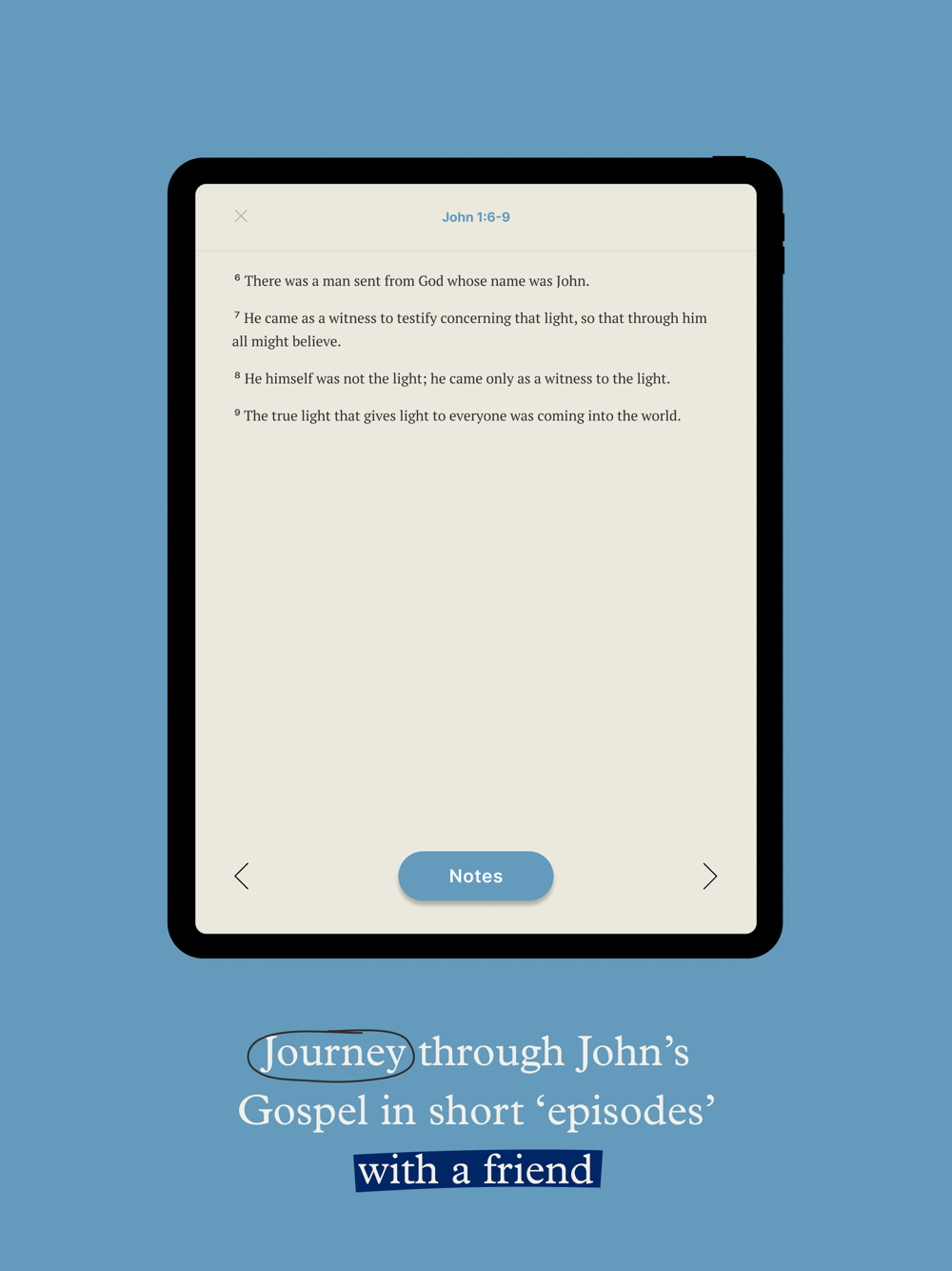 The Bible text is presented verse-by-verse in short ‘episodes’, so you can enjoy reading at your own pace with a friend