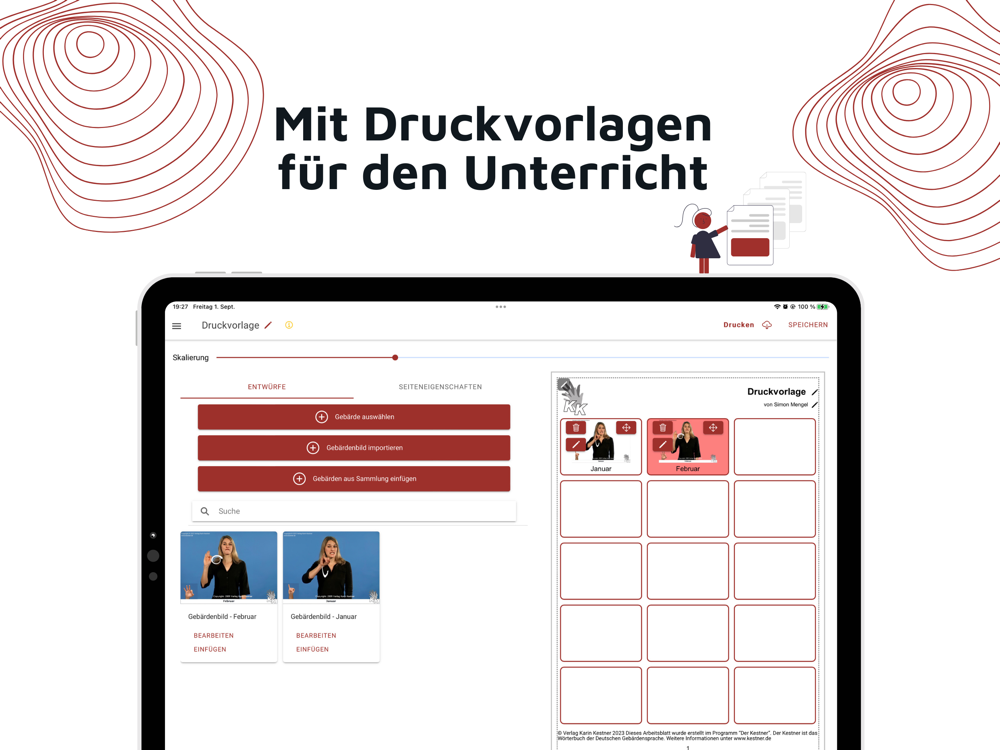 Die Gebärdenbilder können Sie dann in Druckvorlagen einfügen und so mit dem Kestner Arbeitsblätter und Unterrichtsmaterialien erstellen. In Gebärdenbildern und Druckvorlagen können Sie die ca. 3500 Symbole der Mulberry Symbolsammlung einfügen. Die Gebärdenbilder und Druckvorlagen können Sie ausdrucken oder herunterladen.