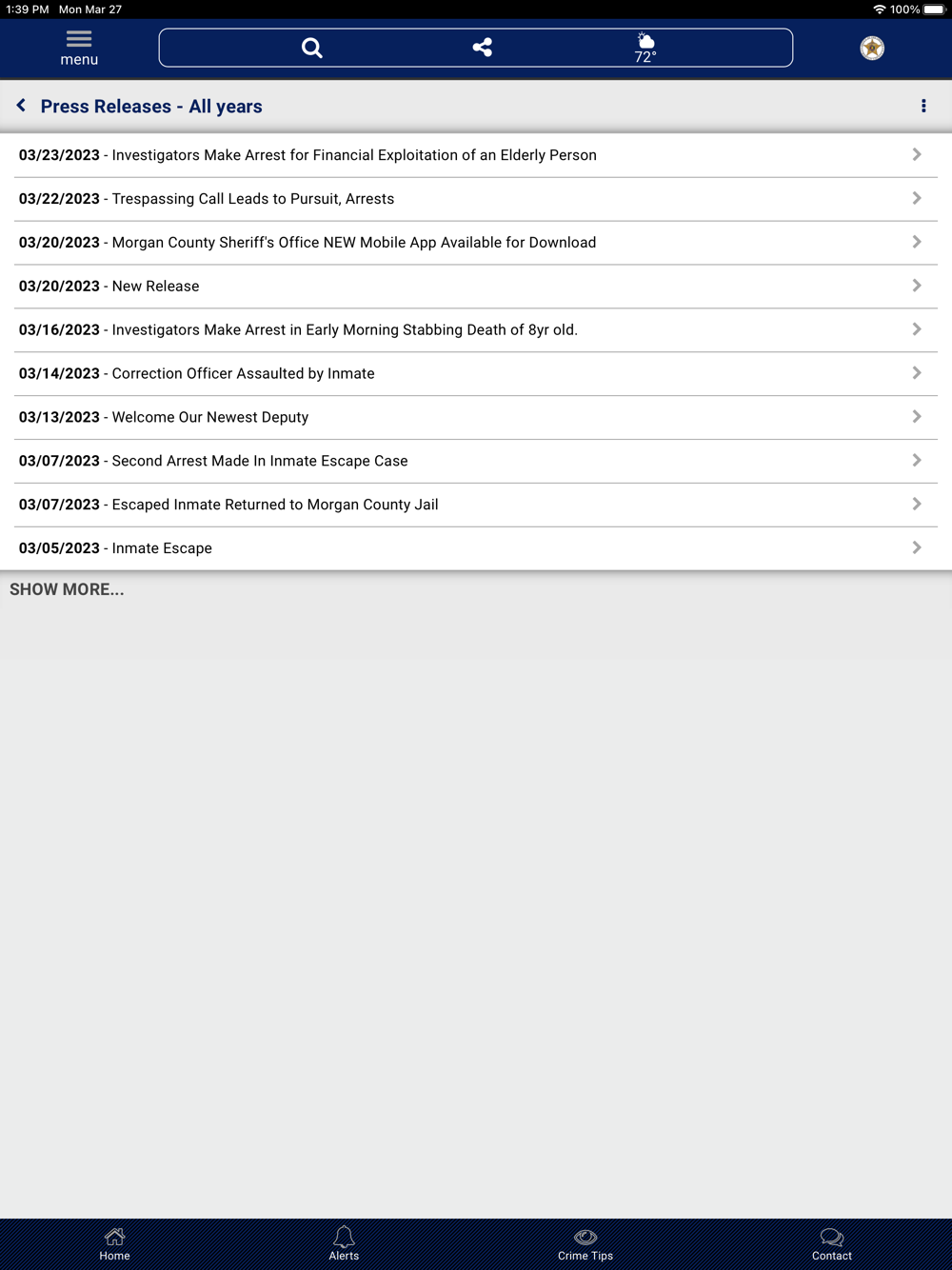 The app has public information for press releases, inmates, most wanted, sex offenders, and special alerts. Crime tips and contact us messages can be sent to the Sheriff's Office.