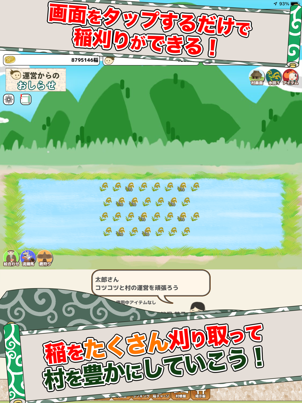 ※ゲーム開始後に稲が生えてこない場合、画面を何度か切り替えていただき、水田画面を表示したまましばらくお待ち下さい。