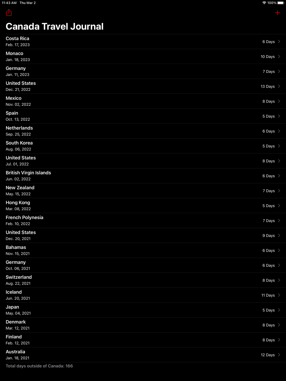 Keep track of your trips outside Canada from the comfort of your mobile device. Canada Travel Journal is a modern solution for Canadian temporary and permanent residents to easily and privately maintain records of their international trips for immigration purposes.