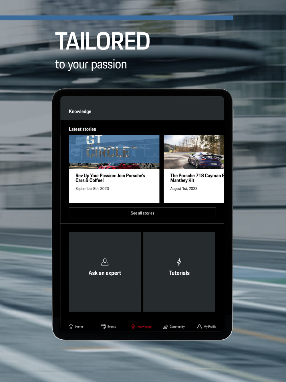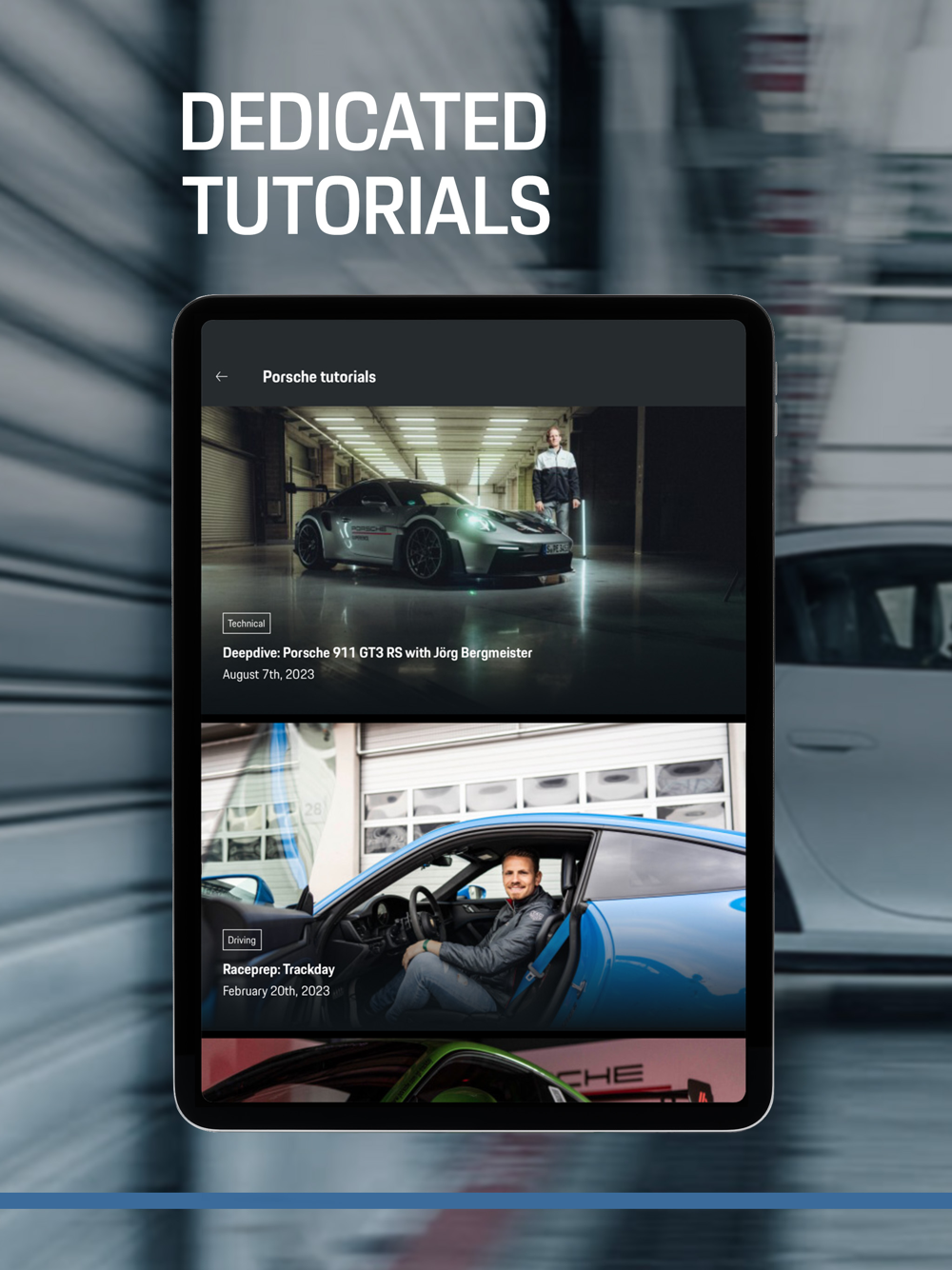 - exciting stories from the world of Porsche as well as tutorials from world-class racing drivers. It’s exclusive content, tailored to your interests.