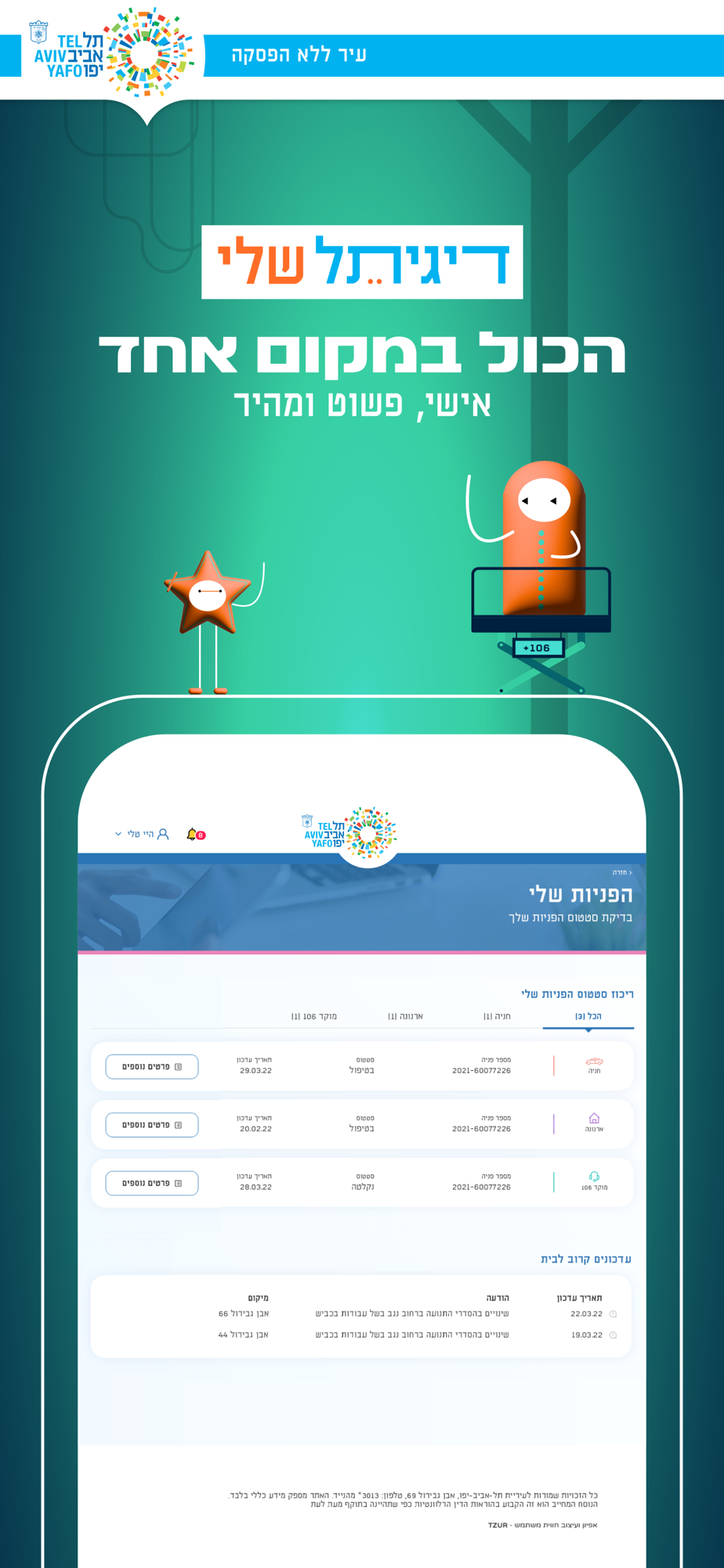 דיגיתל שלי - הכל במקום אחד! שער הכניסה לכל המידע, ההטבות והשירותים הדיגיטליים של עיריית תל אביב-יפו מותאמים אישית לכל תושב ותושבת בעיר