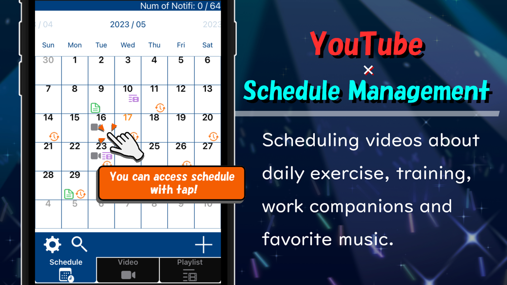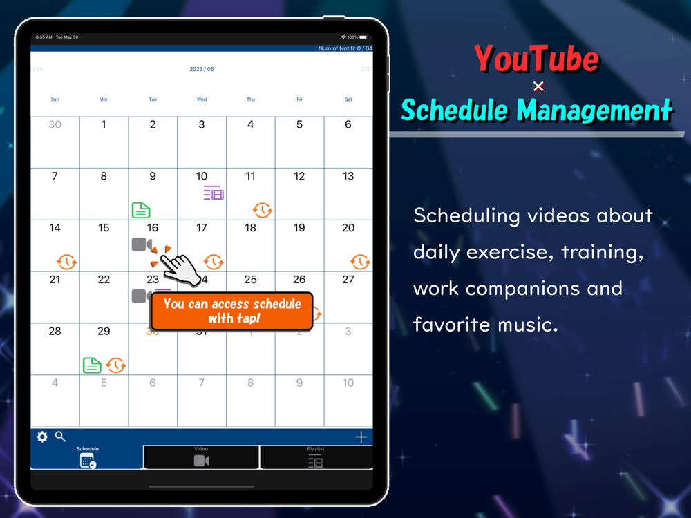 The app support you so that you can easily watch the desired video on the scheduled date and time with a chronological approach such as a calendar and timetable, and a search approach using tags and search words.