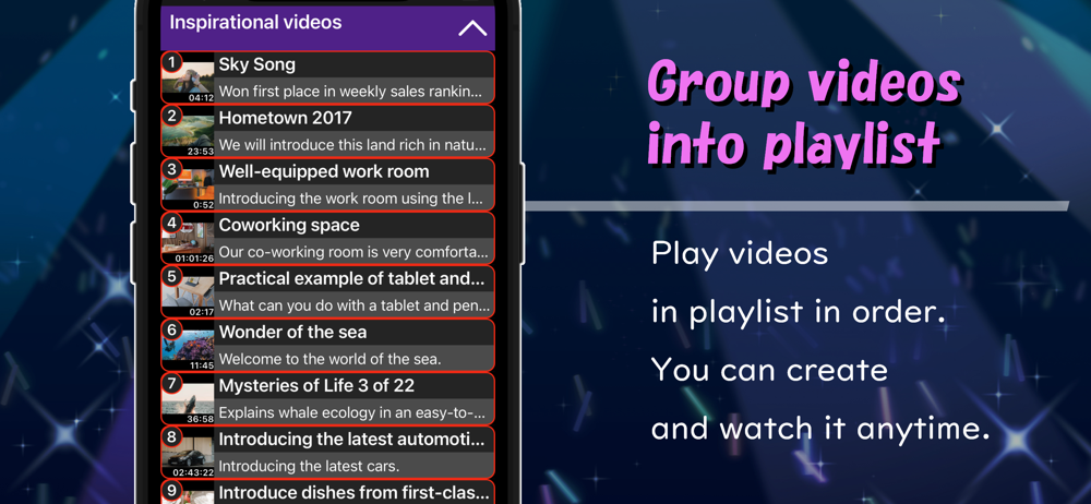 In addition, you can use convenient functions such as the ability to centrally manage videos in a group with a playlist and the ability to share playlists with other users.