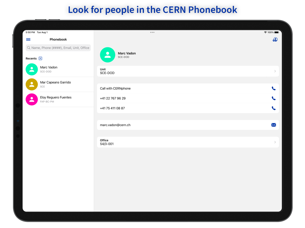• Phonebook: find people, who a number belongs to, call on CERNphone