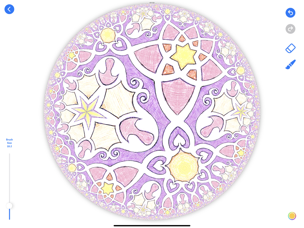 The app squashes the whole infinite hyperbolic plane into a circle (called the Poincare Disk). Strange and fascinating repeating patterns are made possible by this unique app. The motif of the pattern becomes smaller and smaller as it gets closer to the edge of the circle, repeating an infinite number of times.