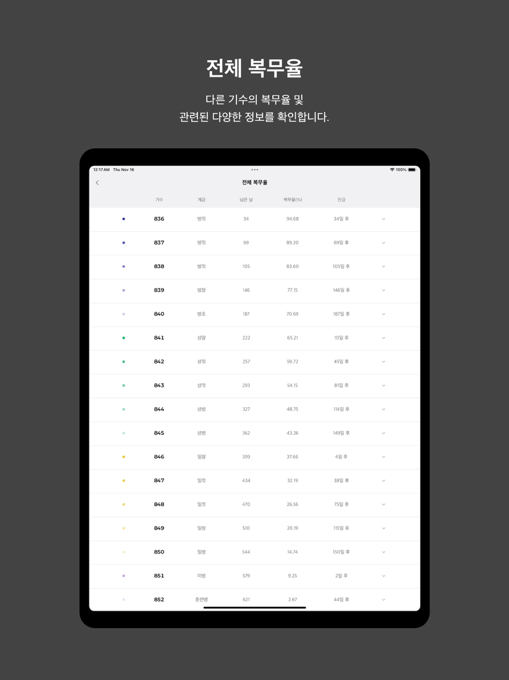 1. 복무율: 본인의 기수와 계급에 따라 전역일과 계급 진급일, 다음 호봉 진급일을 직관적으로 보여줍니다. 또한 다른 기수의 복무율도 확인할 수 있습니다.