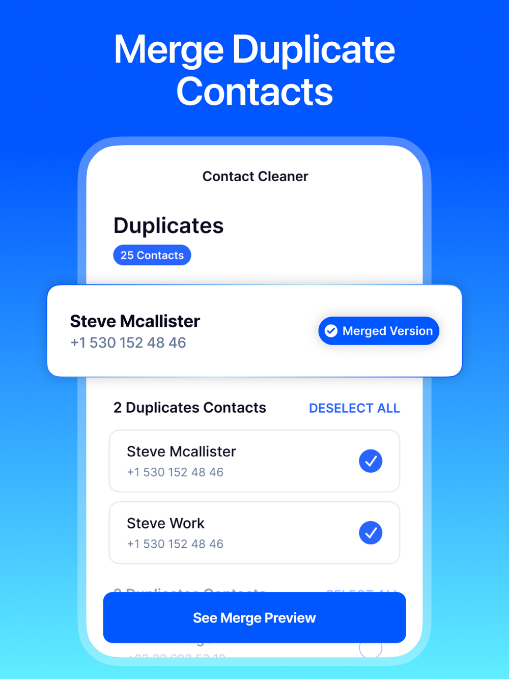 Quickly find duplicate contacts and merge easily.
