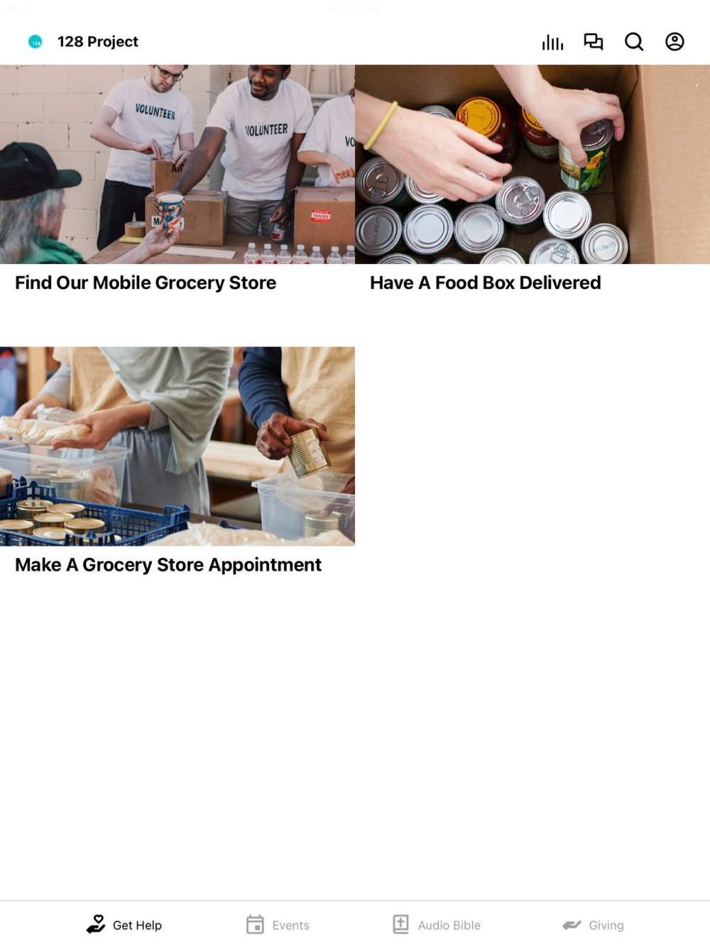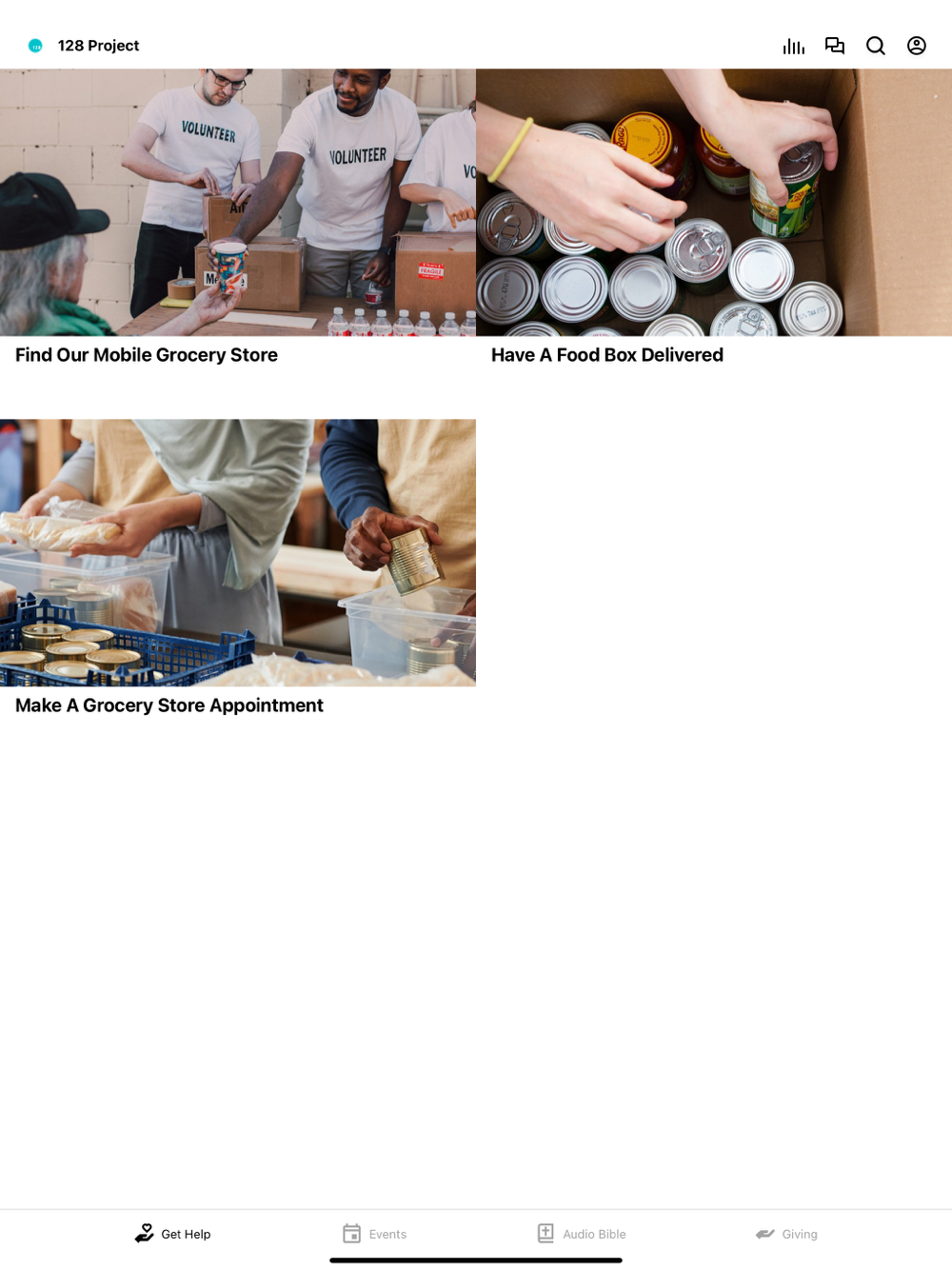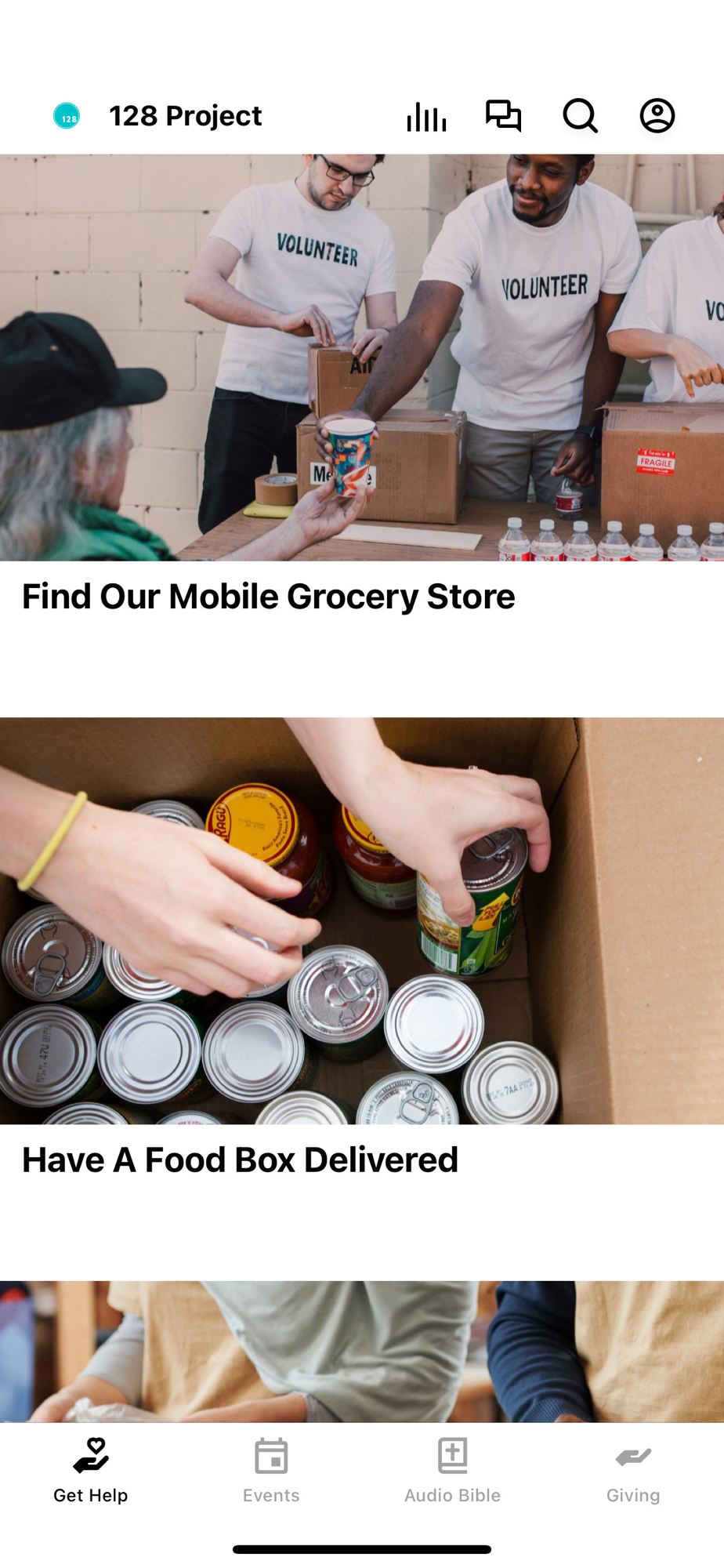 With this app you can: sign up to volunteer, request a food box delivery, make a grocery store appointment, and informed on the day to day life of The 128 Project.