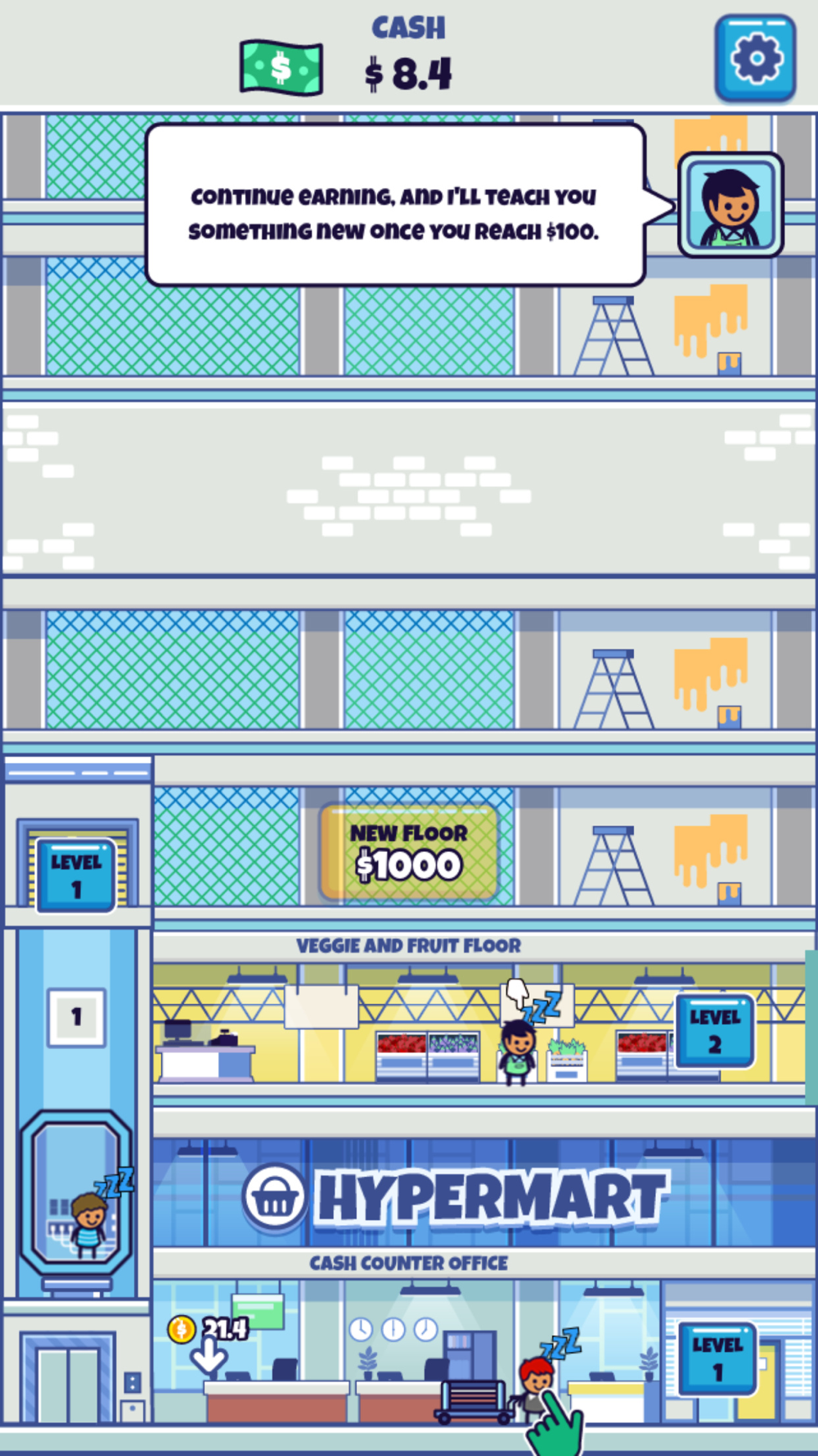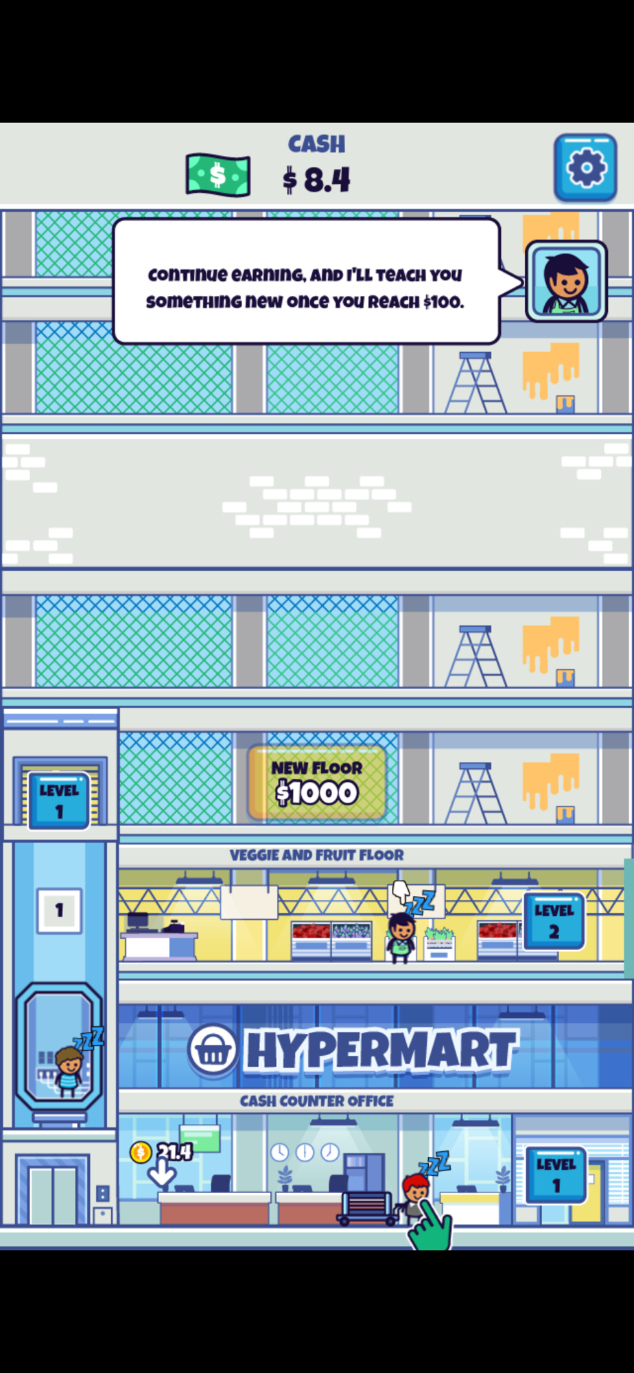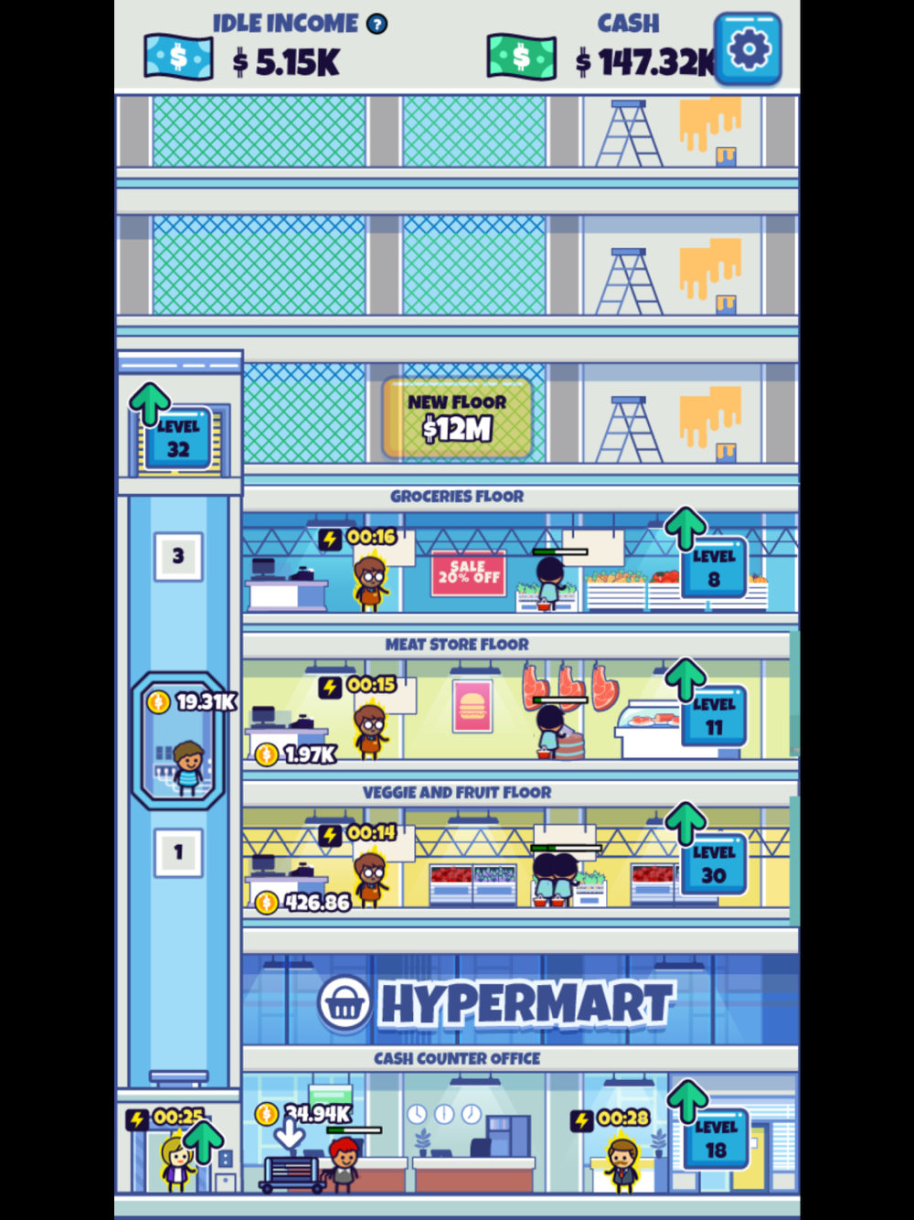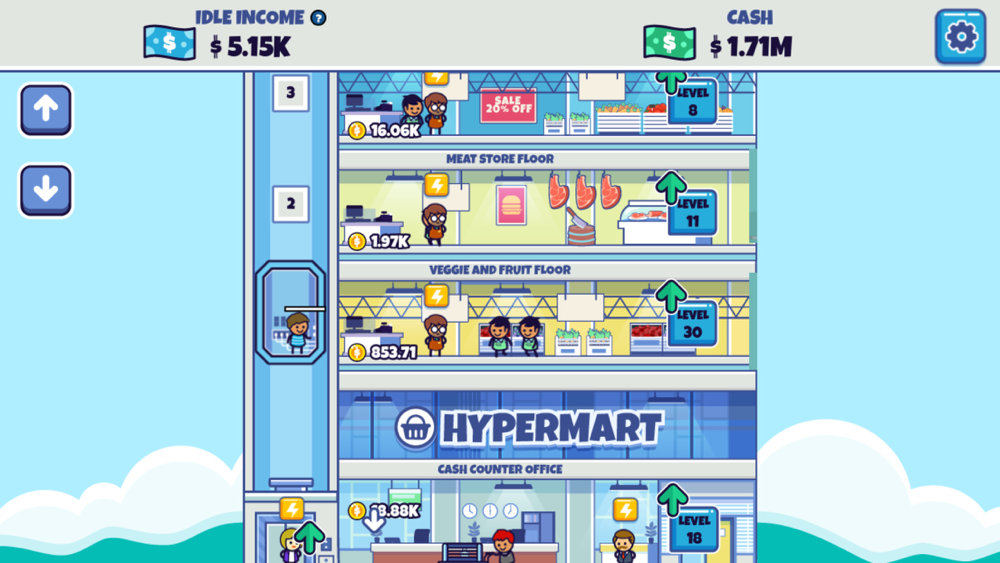 Tap on your workers to start producing goods to sell. Next, transport profits to the cash counter office with an elevator. Finally, transport your earnings to your account. Use your earnings to upgrade your Hypermart-Supermarket, elevator and warehouse. Automate tasks by hiring managers at each facility.