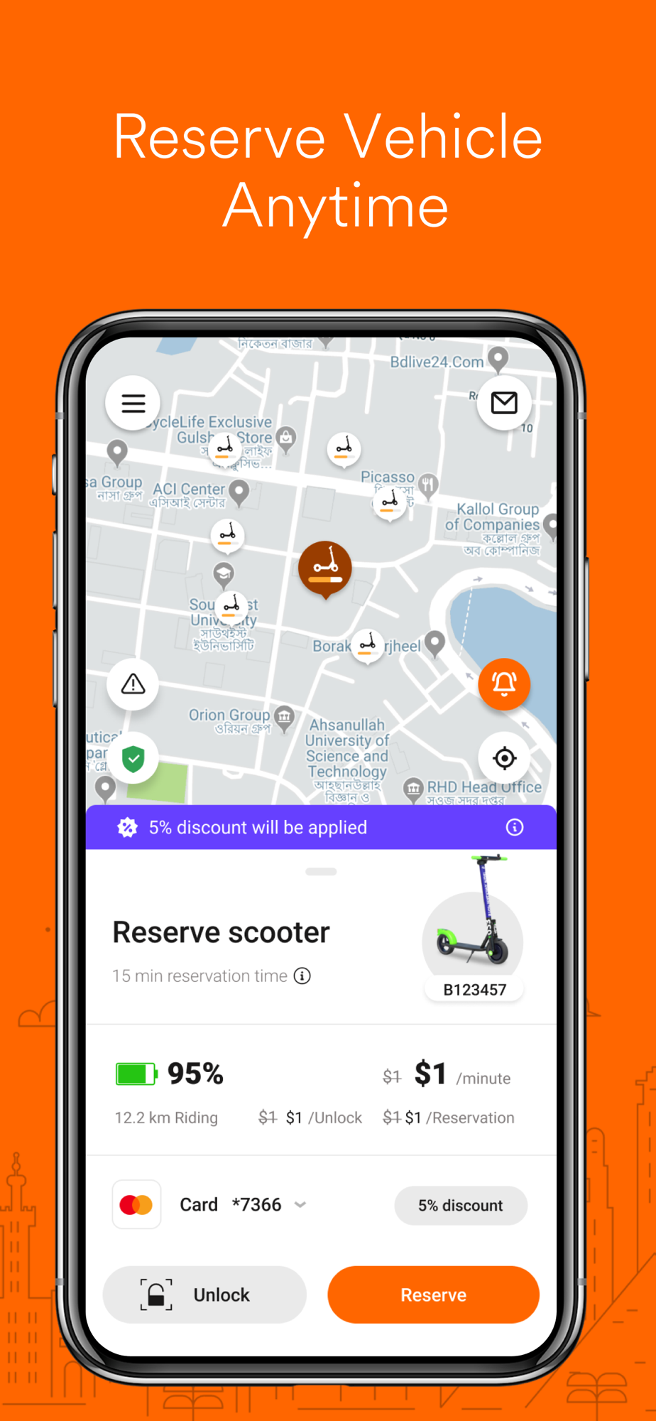 The app will show you the locations of available scooters in the area. Make sure to read about the services provided by Sunset Rides and choose the scooter that best suits your needs.