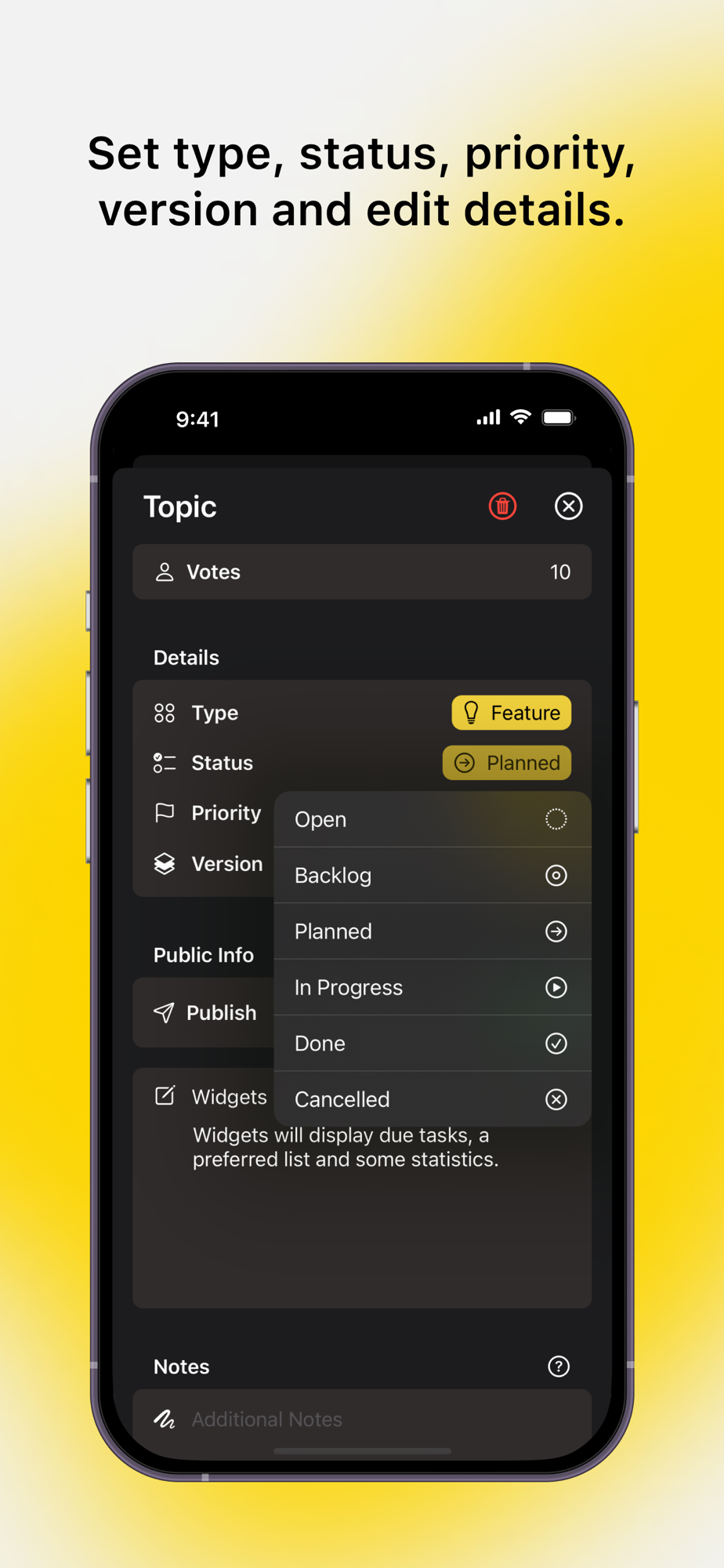 The RoadKit app for iOS, iPadOS and macOS makes it easy to manage your feature requests and bug reports, with a simple ticketing system that allows you to track and prioritize issues. And with the ability to merge similar tickets, you can keep your ticket queue clean and organized, making it easier to manage your development process. RoadKit makes it easy to share a changelog with your users, so they can see exactly what's new.
