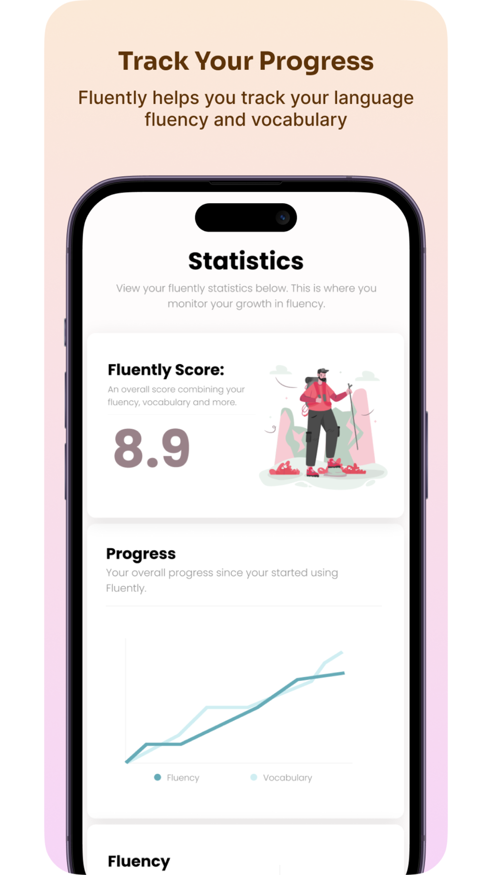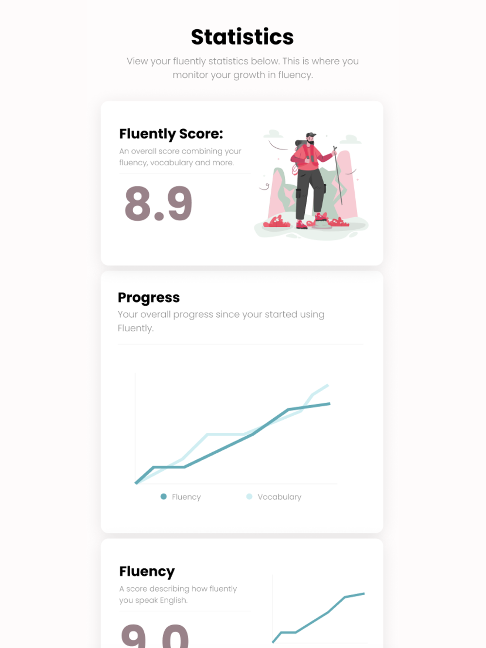 Progress tracking: We believe that seeing your progress is a potent motivator. Fluently AI empowers you with comprehensive progress tracking tools. Monitor your improvement in speaking English fluently, track your vocabulary growth, and gain insights into your language proficiency. It's like having a personal language coach guiding you every step of the way.