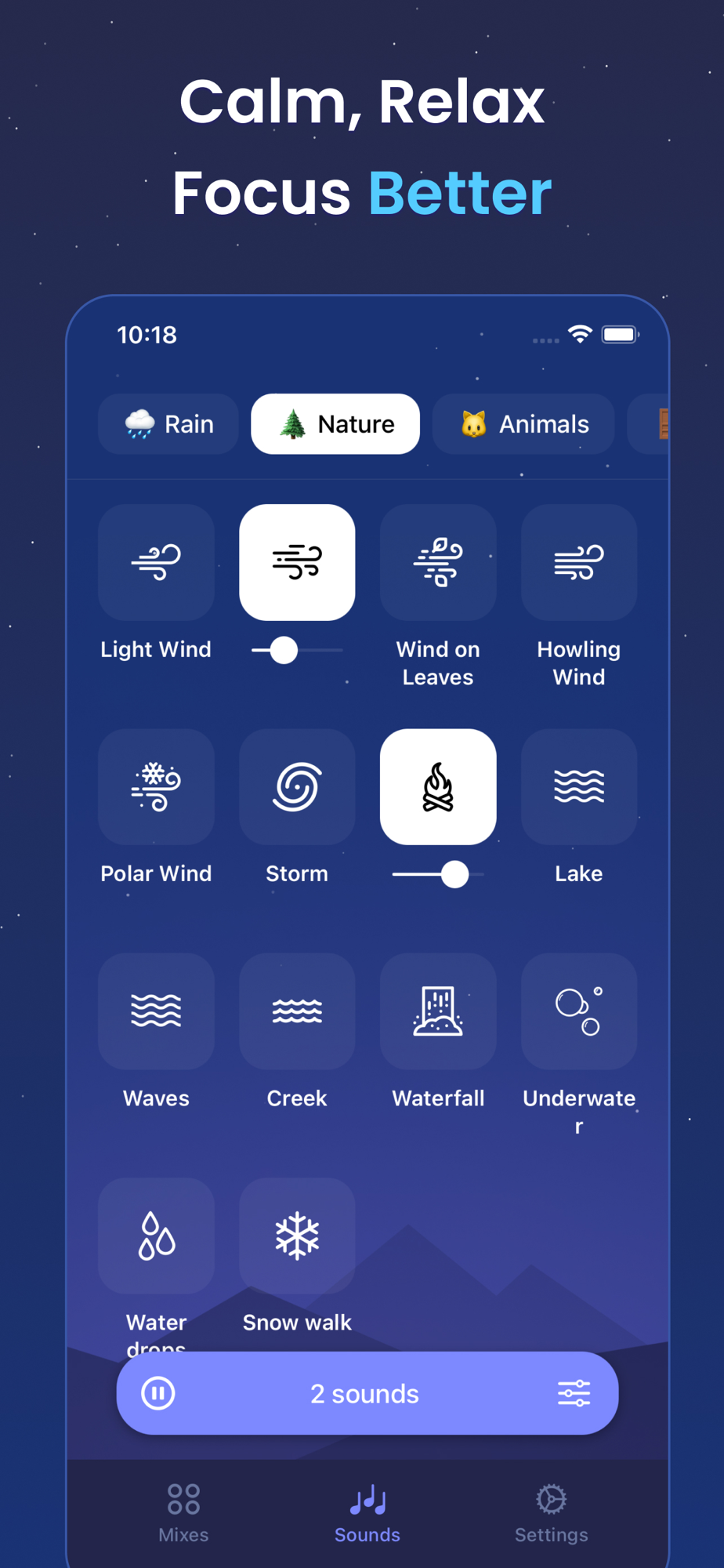 Try and be amazed at how easy it is to fall asleep with soothing sounds for sleeping (white noise). Choose and combine your own sounds mixes to relieve stress or increase concentration. Set a timer and do not worry about the battery of the phone, the timer will smoothly drown out sounds.