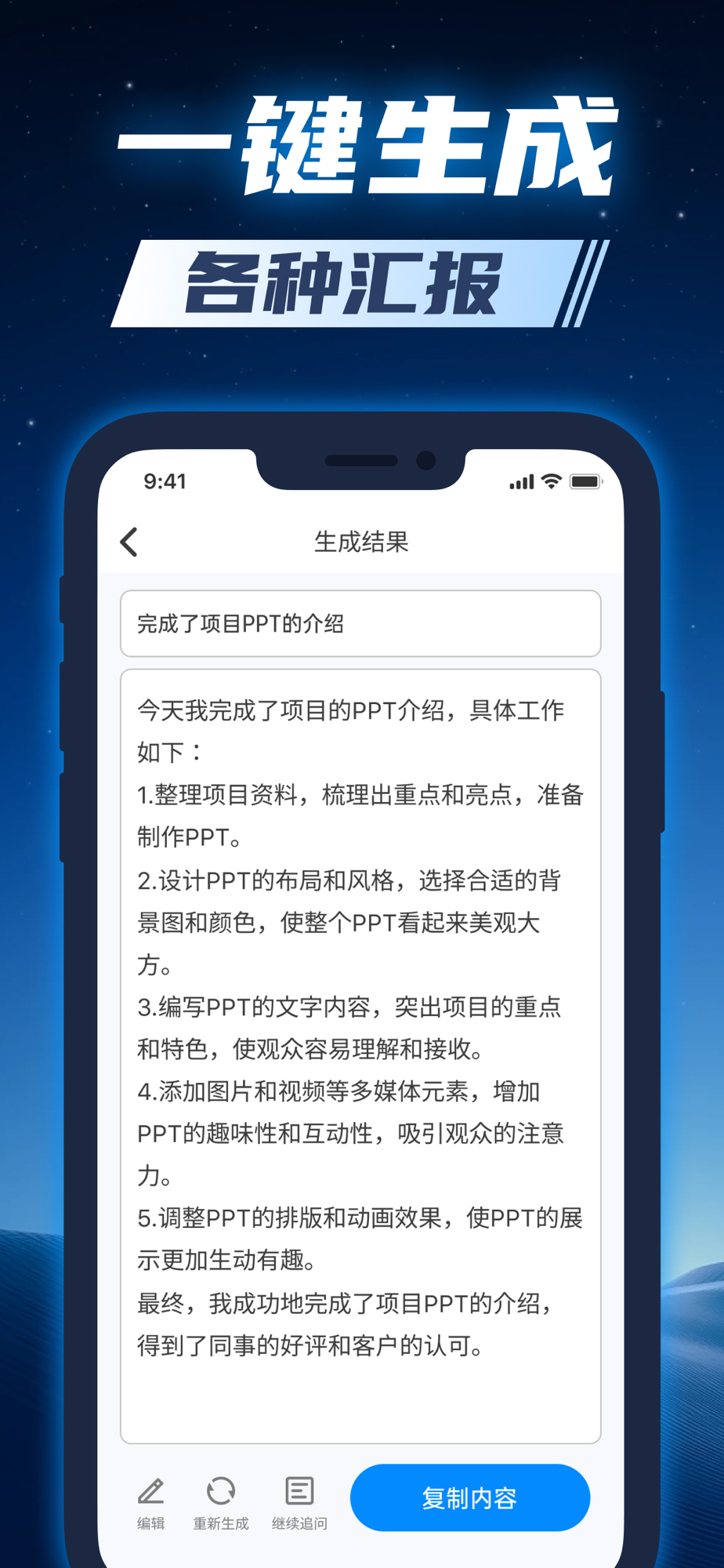 您只需输入简单的要点,比如“拜访了XX客户”、“完成了XX工作”,即可快速生成完整详细的报告。