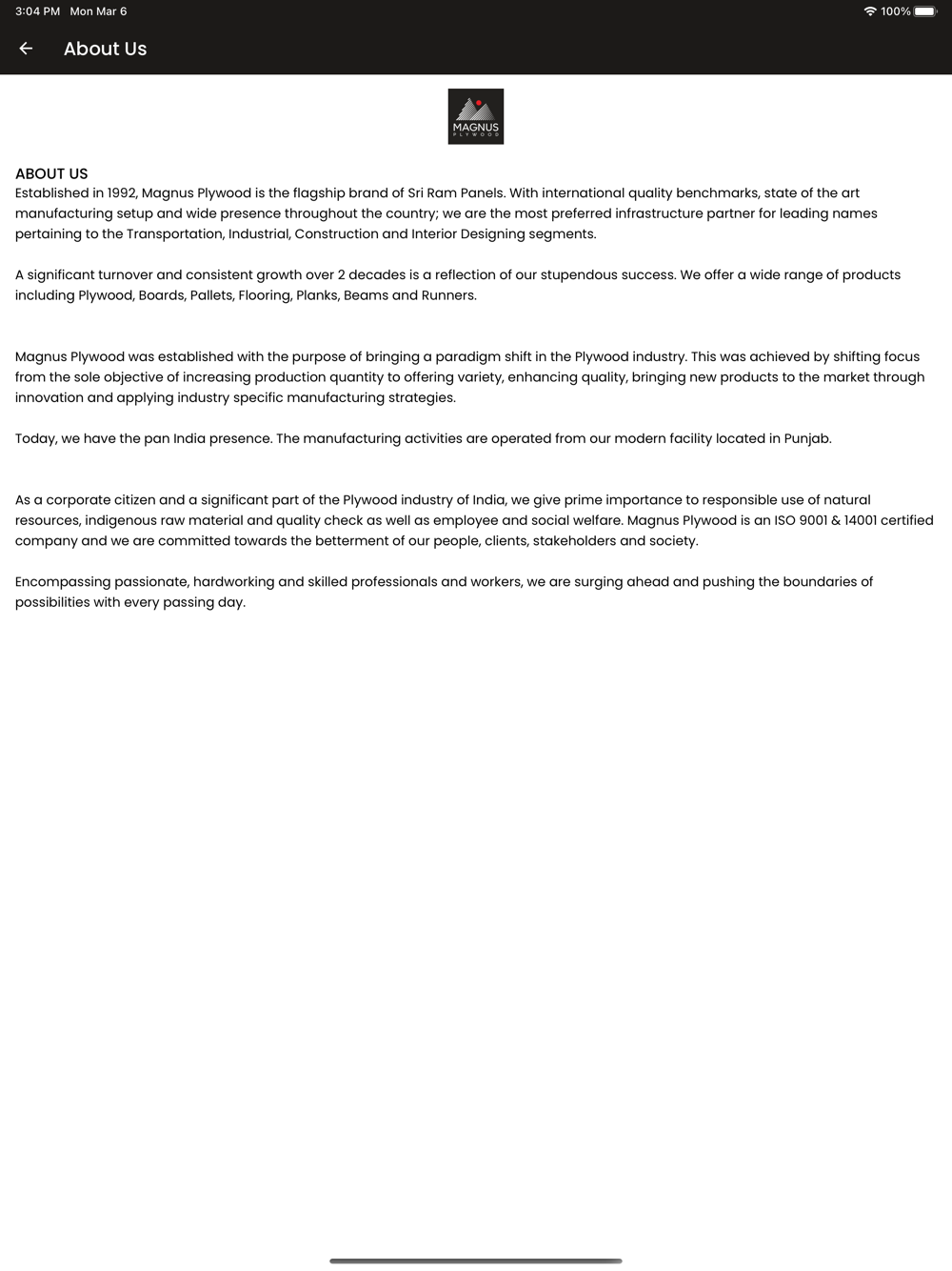 Established in 1992, Magnus Plywood is the flagship brand of Sri Ram Panels. With international quality benchmarks, state of the art manufacturing setup and wide presence throughout the country; we are the most preferred infrastructure partner for leading names pertaining to the Transportation, Industrial, Construction and Interior Designing segments.