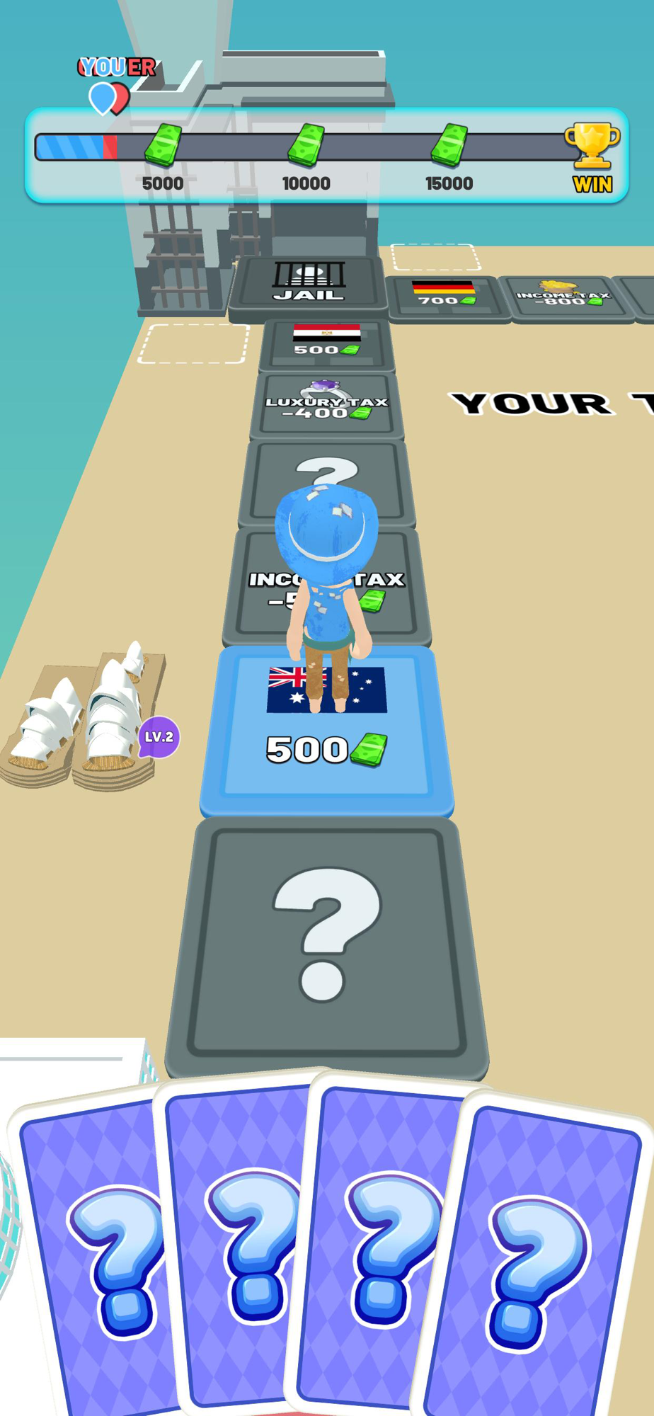 Choose card to move. Occupy and upgrade area to get more toll. Face mysterious situation. Keep moving forward until one got 20k.