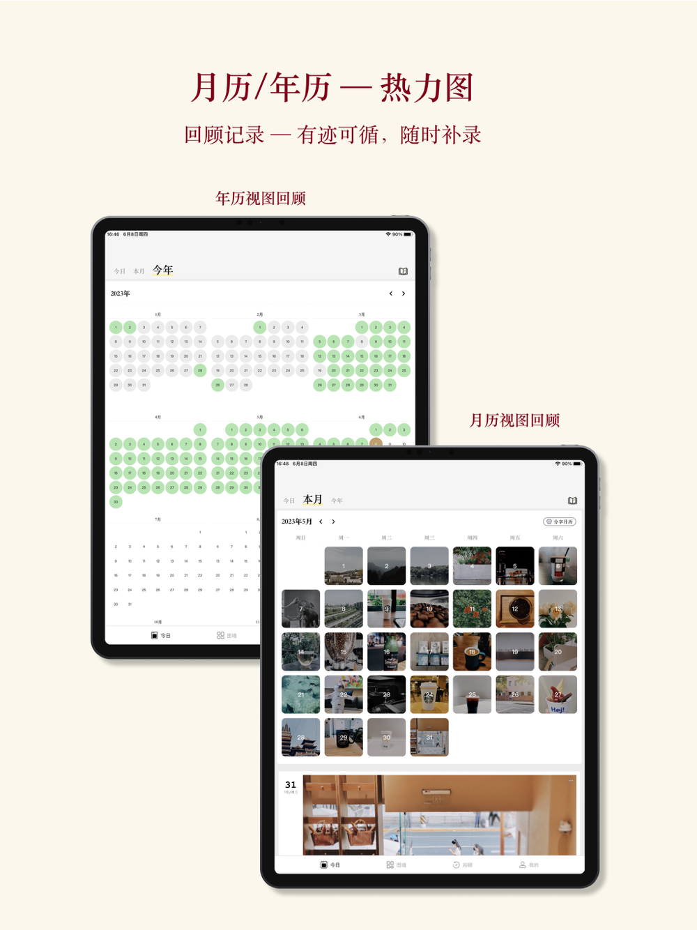◎ 按月、按年来回顾自己的记录日历,还能随时补录;