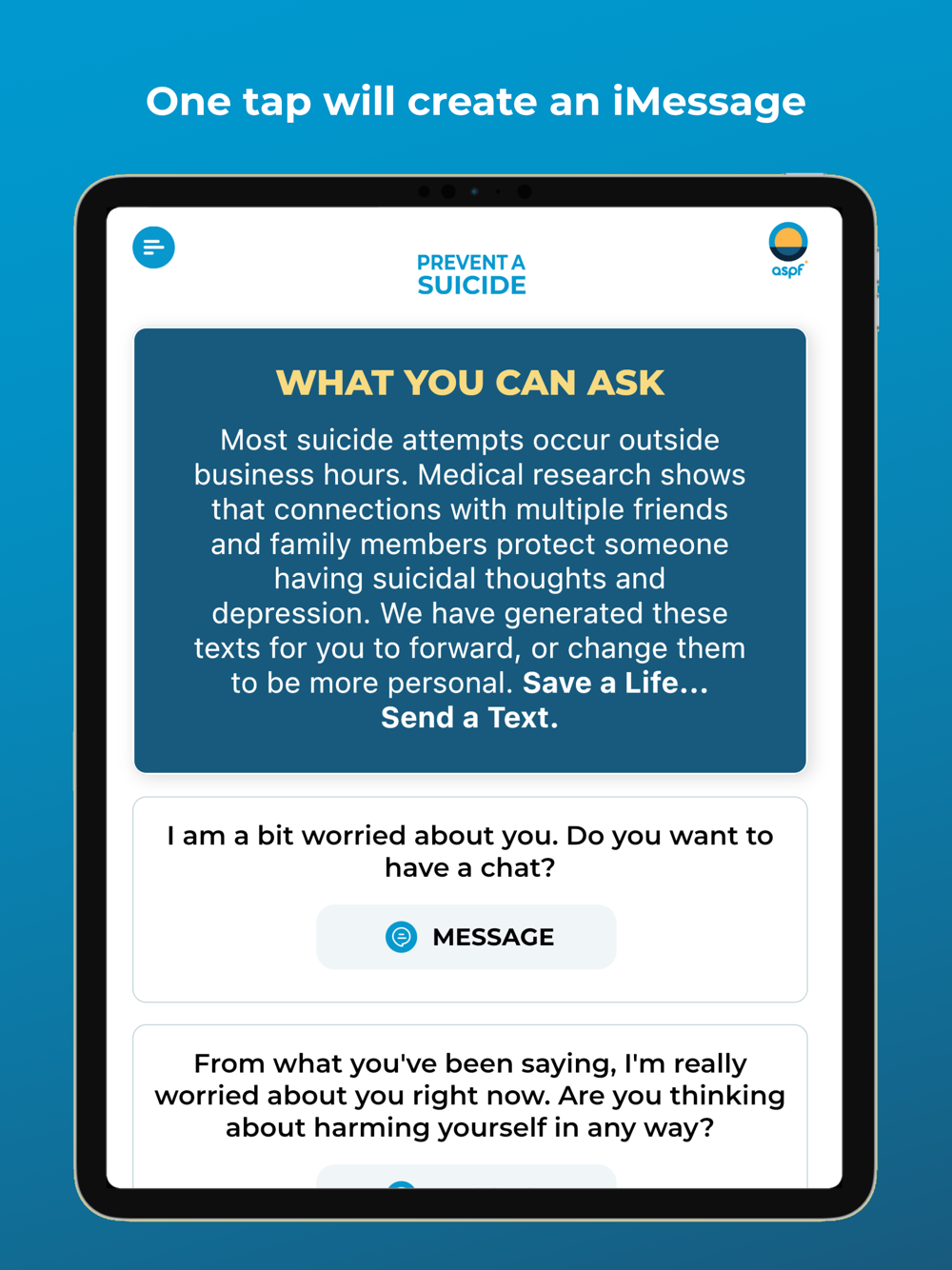 Prevent A Suicide is more than just an app. It is a way to show someone that you care, that you understand, and that you are there for them. It is a way to prevent a suicide by sending a message, saving a life. The app is proudly created by the Australian Suicide Prevention Foundation, which is a government registered charity. We aim to reduce thoughts of suicide, attempted suicide and deaths from suicide in Australia and around the world.