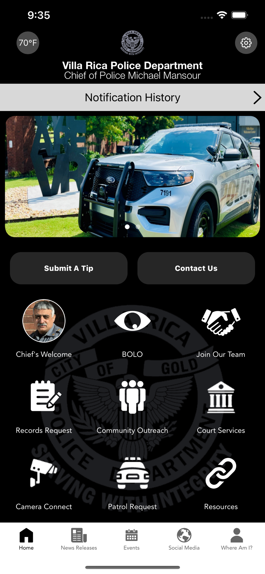 The Villa Rica (Georgia) Police Department Mobile App is an interactive app which will help improve our communication with the citizens of Villa Rica and surrounding areas. The purpose of this app is to improve our ability to communicate with our citizens Information which will include, but not be limited to Breaking News & Alerts, Submit Records Requests, Join Our Team and more. Citizens may Submit a Tip directly through the app, as well as see and share social media posts. This app represents a huge step forward for the Villa Rica community by providing the best way for citizens to communicate and partner with the Villa Rica Police Dept.