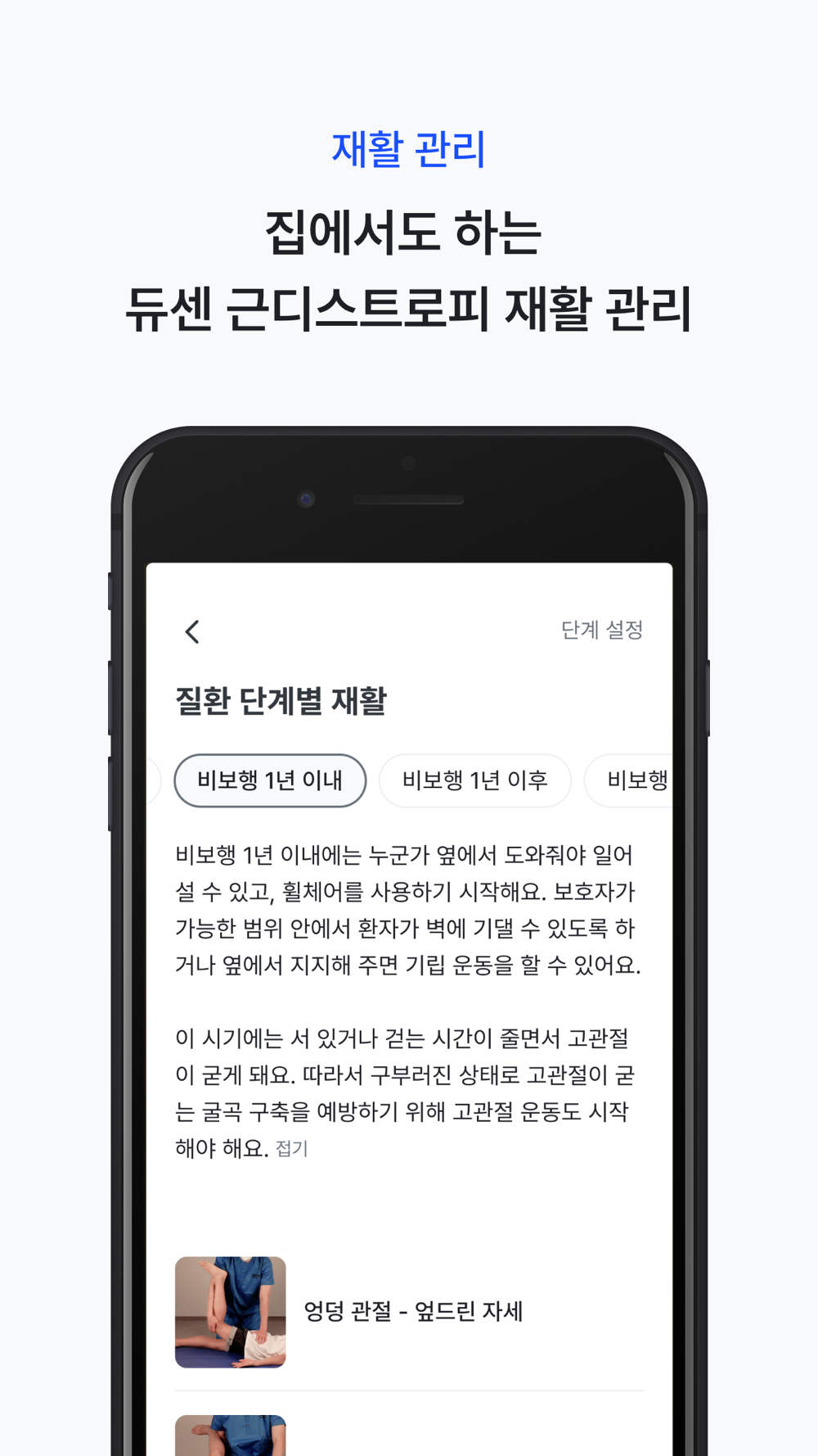 d. 듀셴 근디스트로피의 경우, 재활 관리 영상을 통해 집에서도 재활 관리를 할 수 있어요.
