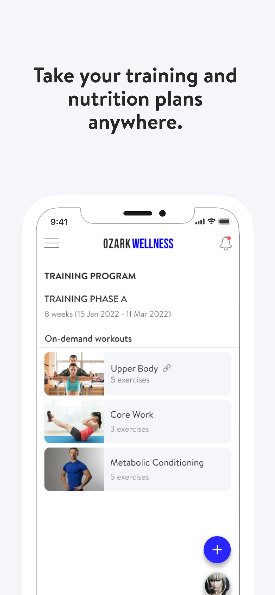 With the Ozark Wellness App, you can start tracking your workouts and meals, measuring results, and achieving your fitness goals, all with the help of your personal trainer.