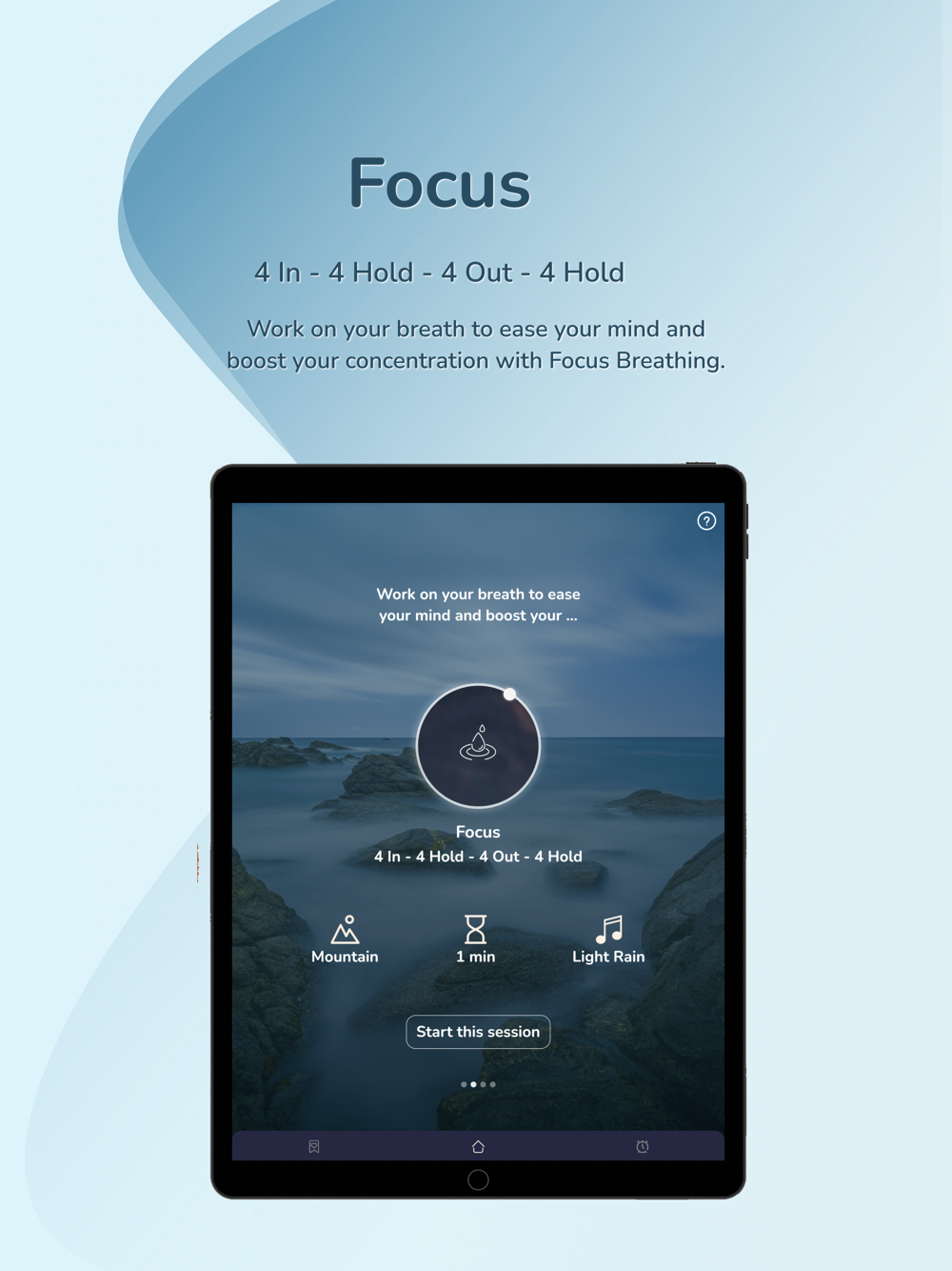 - Focus: Inhale for 4s, hold for 4s, exhale for 4s and hold for 4s
