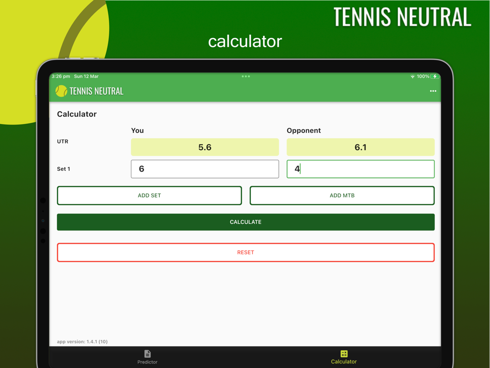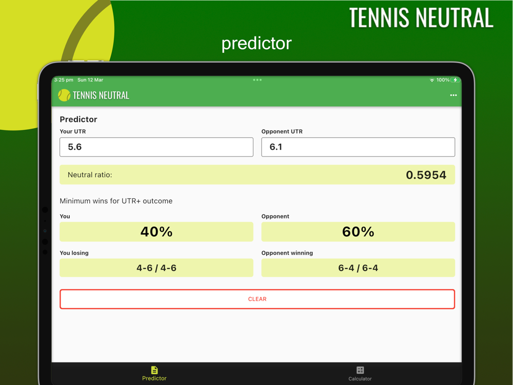 - Enter two UTRs into the app to see the ratio of games that would return a 'neutral' UTR result.