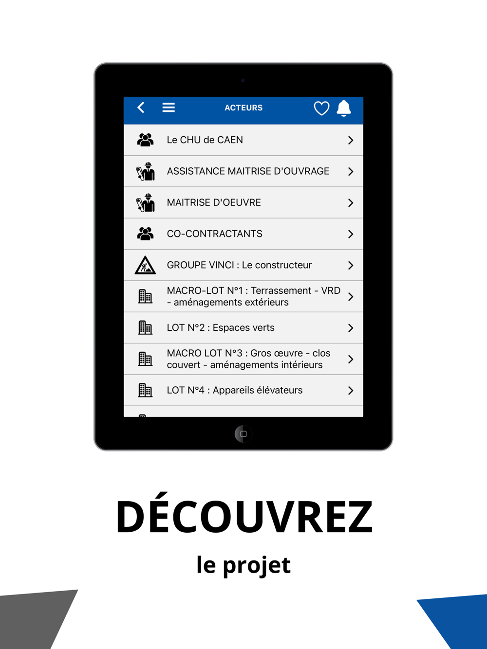Cette application est destinée à l’ensemble des parties prenantes qui souhaitent s’informer sur le Projet CHU CAEN Opération Principale.