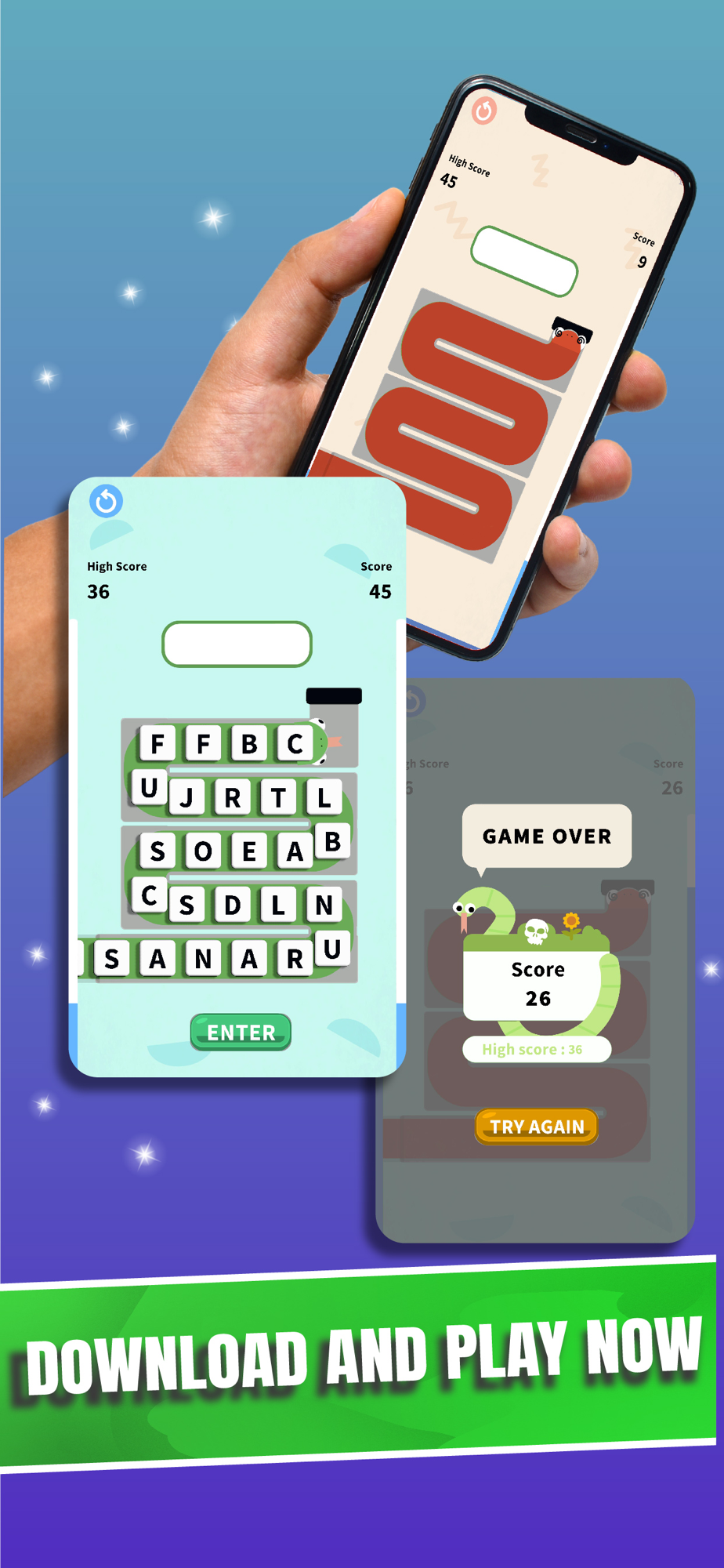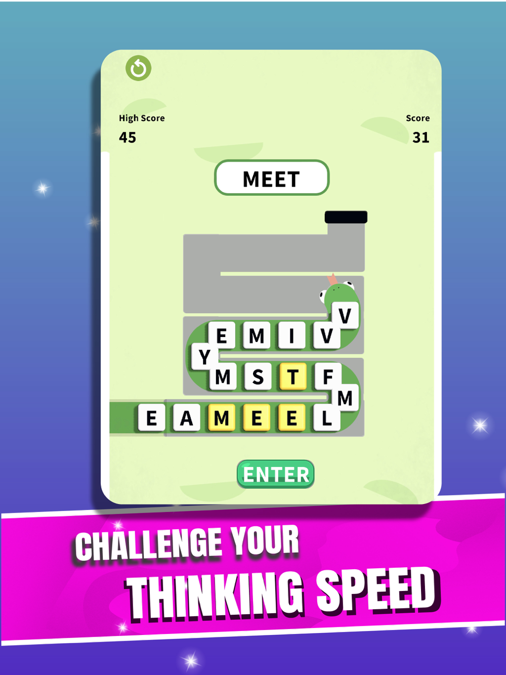 Make longer words to earn more points and unlock bonuses. Freeze the snake for an extra chance to find words!