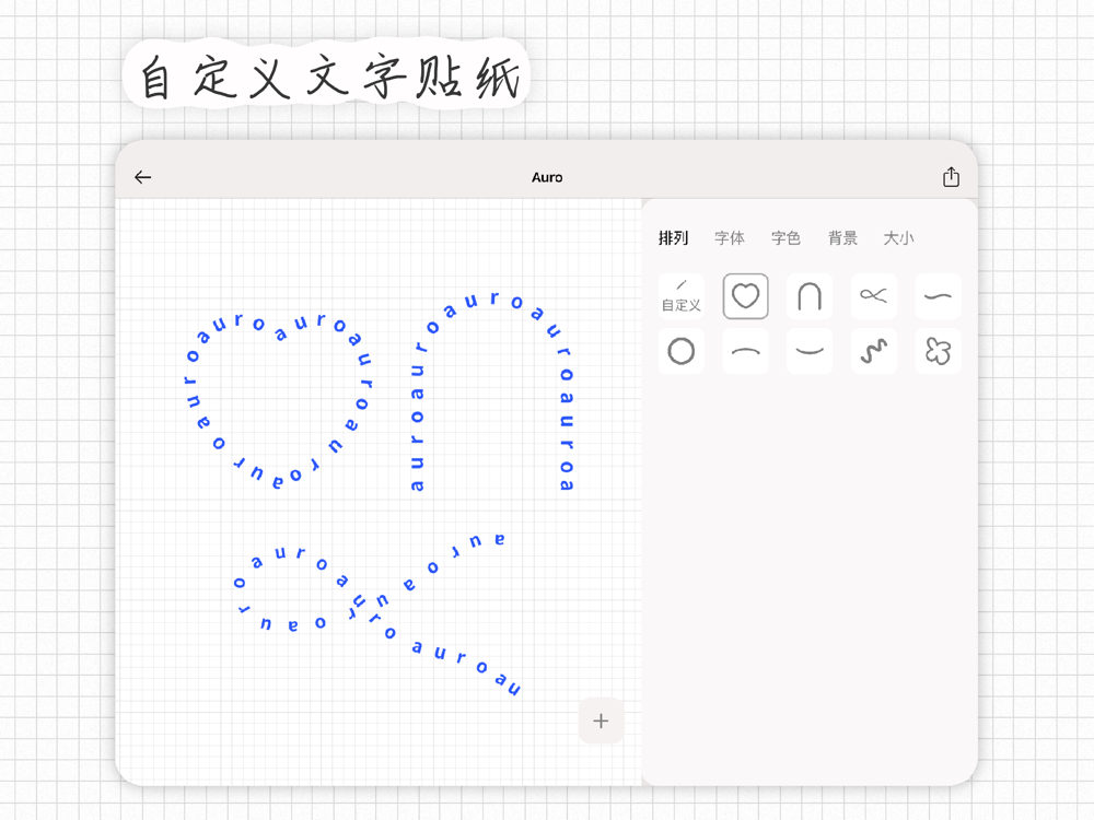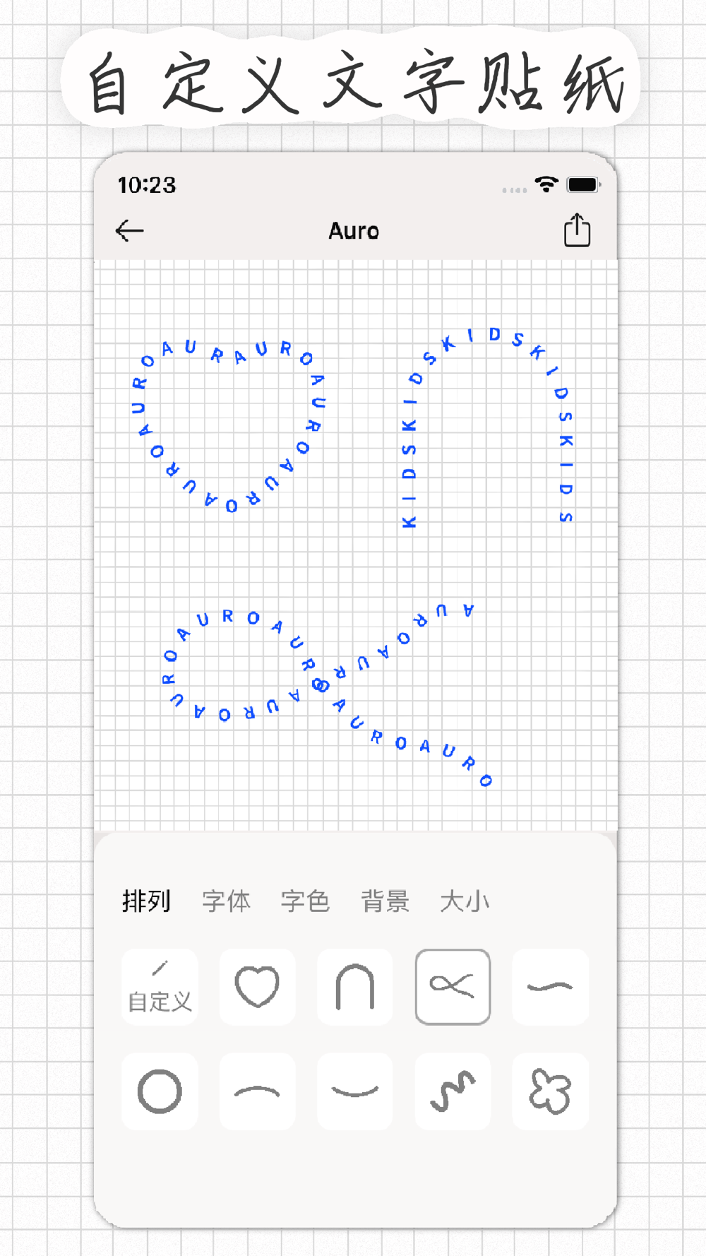 【自由路径贴纸】通过手指画出一条路径,文字可沿路径摆放,轻松做出各种形状的文字贴纸(爱心、波浪、圆形、矩形等形状的贴纸)