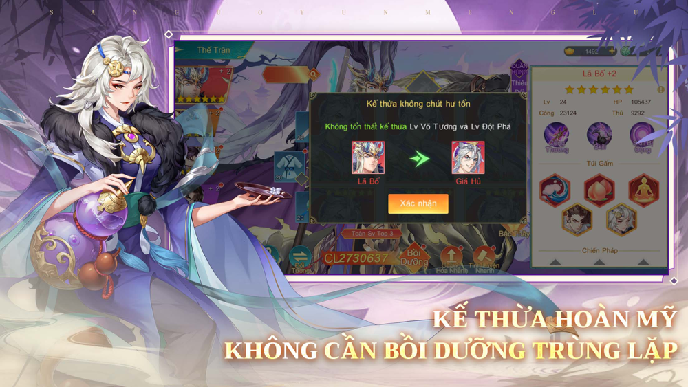 Không cần lo lắng việc hao phí tài nguyên! Đổi tướng nhanh, đổi đội hình, thừa kế mọi trang bị và tài nguyên.