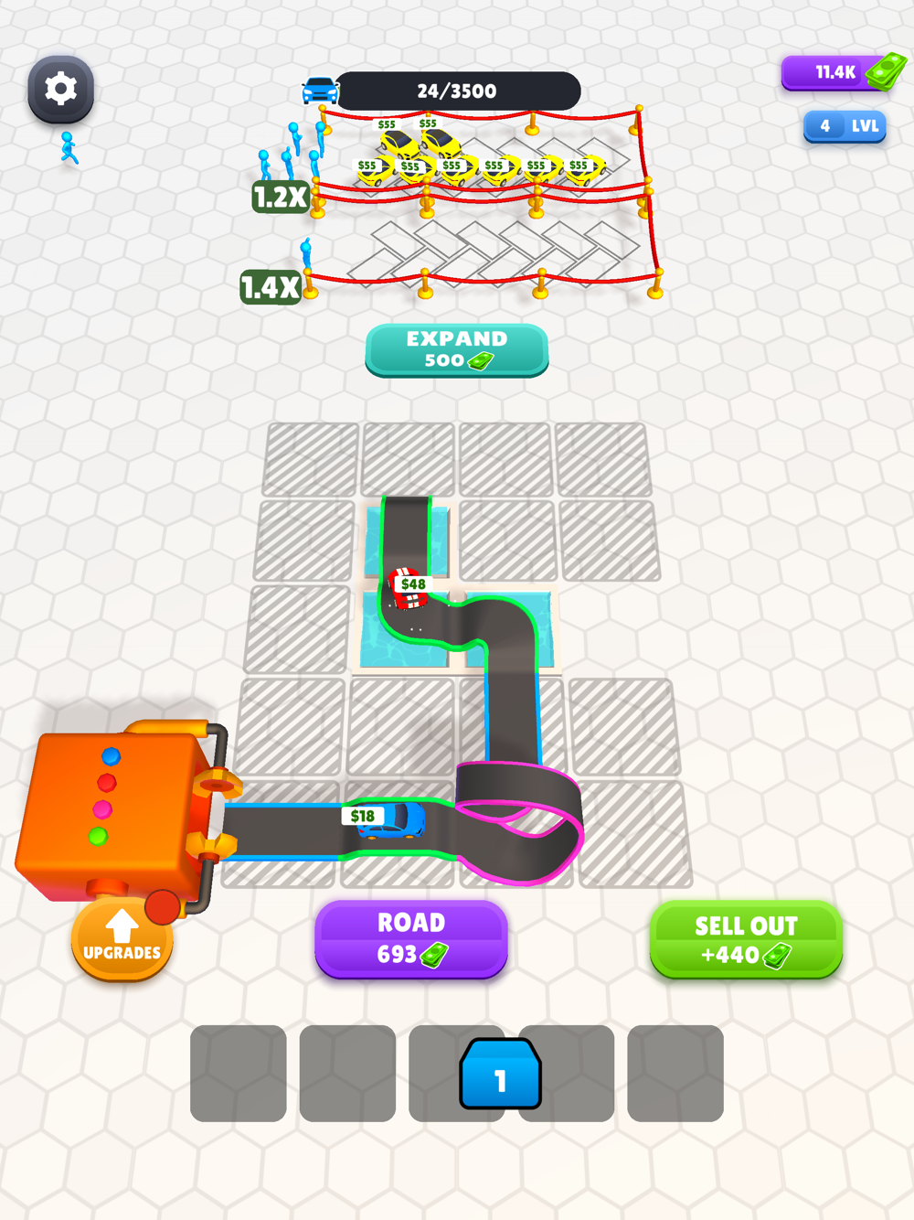 Buy roads and merge them to have different featured ones. Upgrade to earn faster.