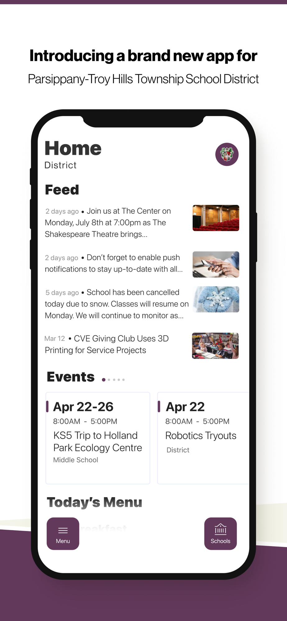 The event section shows a list of events throughout the district. Users can add an event to their calendar to share the event with friends and family with one tap.