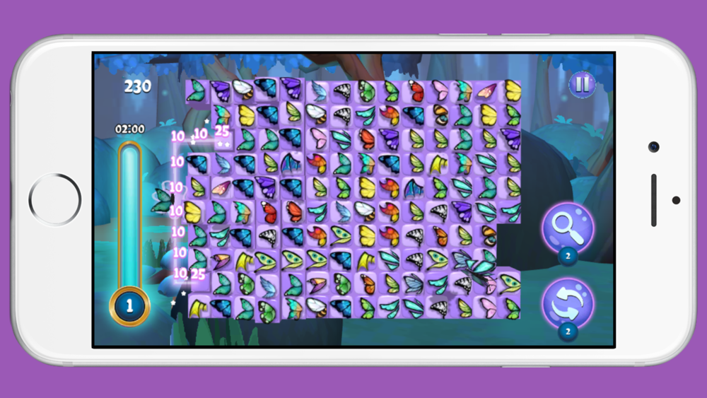 Match two of the same butterfly wings to create beautiful butterflies and make them disappear on the board. But beware! Other wings will block them from being matched, so you have to find the correct path and order to match them. But don't worry if you can't find a way to match them, since you can use power ups which will help you find the matches you are looking for. But keep in mind that those power ups are of limited use, so don't overuse them. So hop in and start creating beautiful Butterflies and watch them all fly to their new home!
