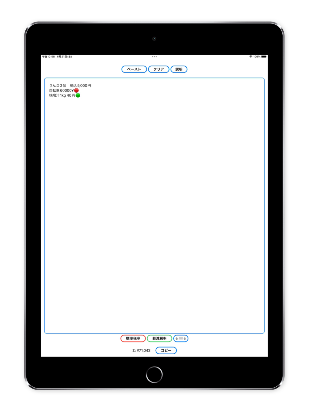 何も考えずに入力もしくはコピペした、項目と金額の羅列から、自動的に金額を抽出して税率込みで合計を計算可能なアプリです。