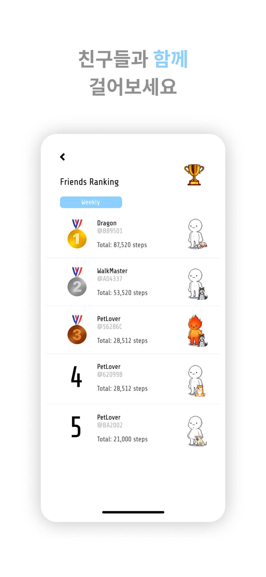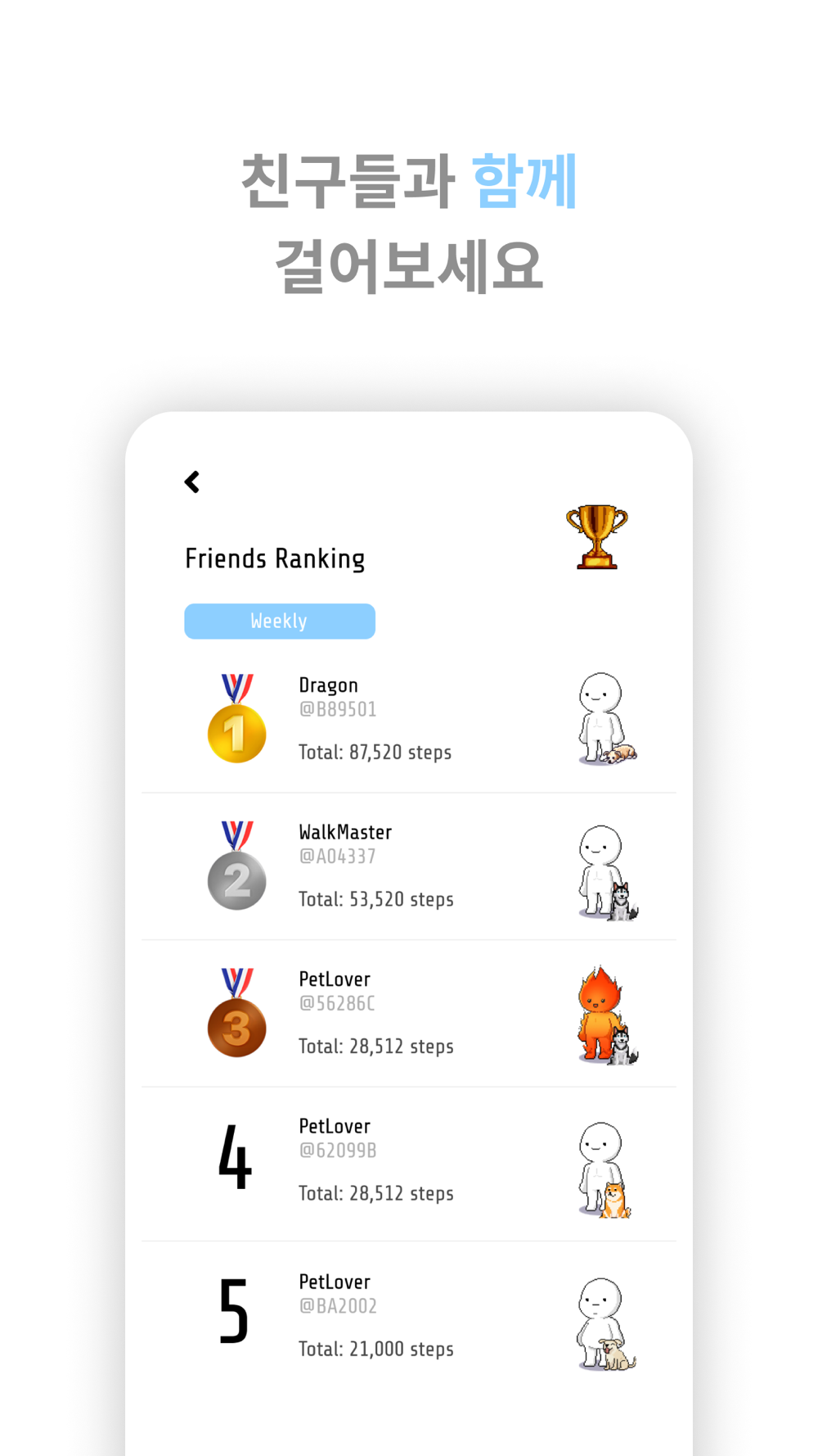 - 친구들과의 걸음수를 비교하여 주간 랭킹을 볼 수 있어요.