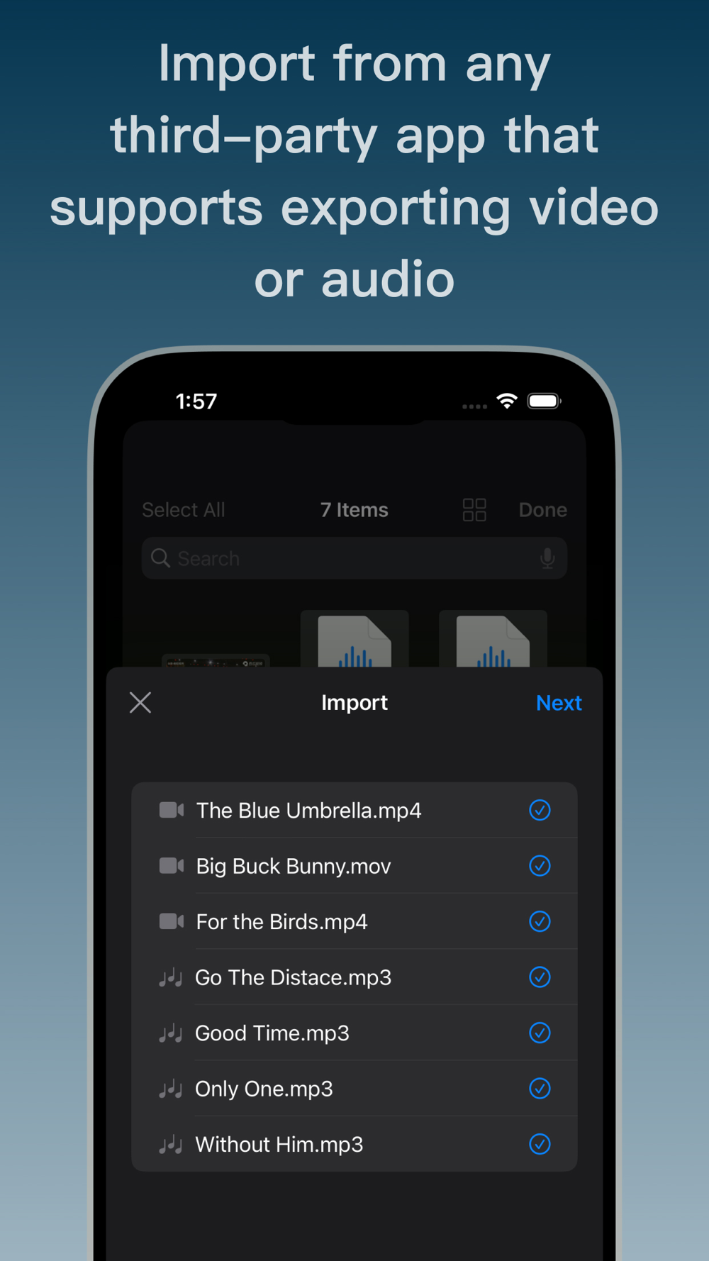 Support importing from the Photos, Files, and any third-party app that supports export.