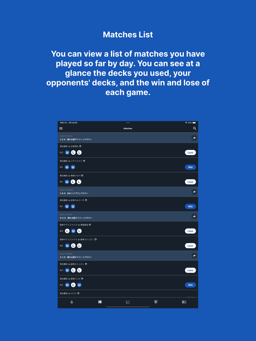 When you use MTG Playbook’s life counter for a match, the match is automatically recorded and can be reviewed later. You can set your deck, event, and opponent's deck for each match. This setup allows you to search match records and perform match analysis.