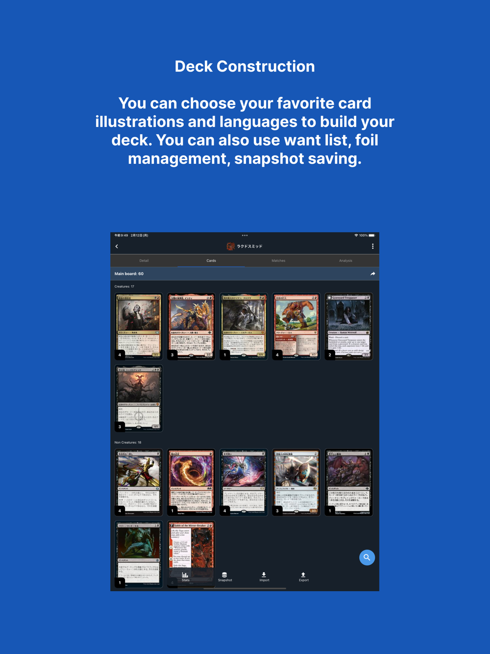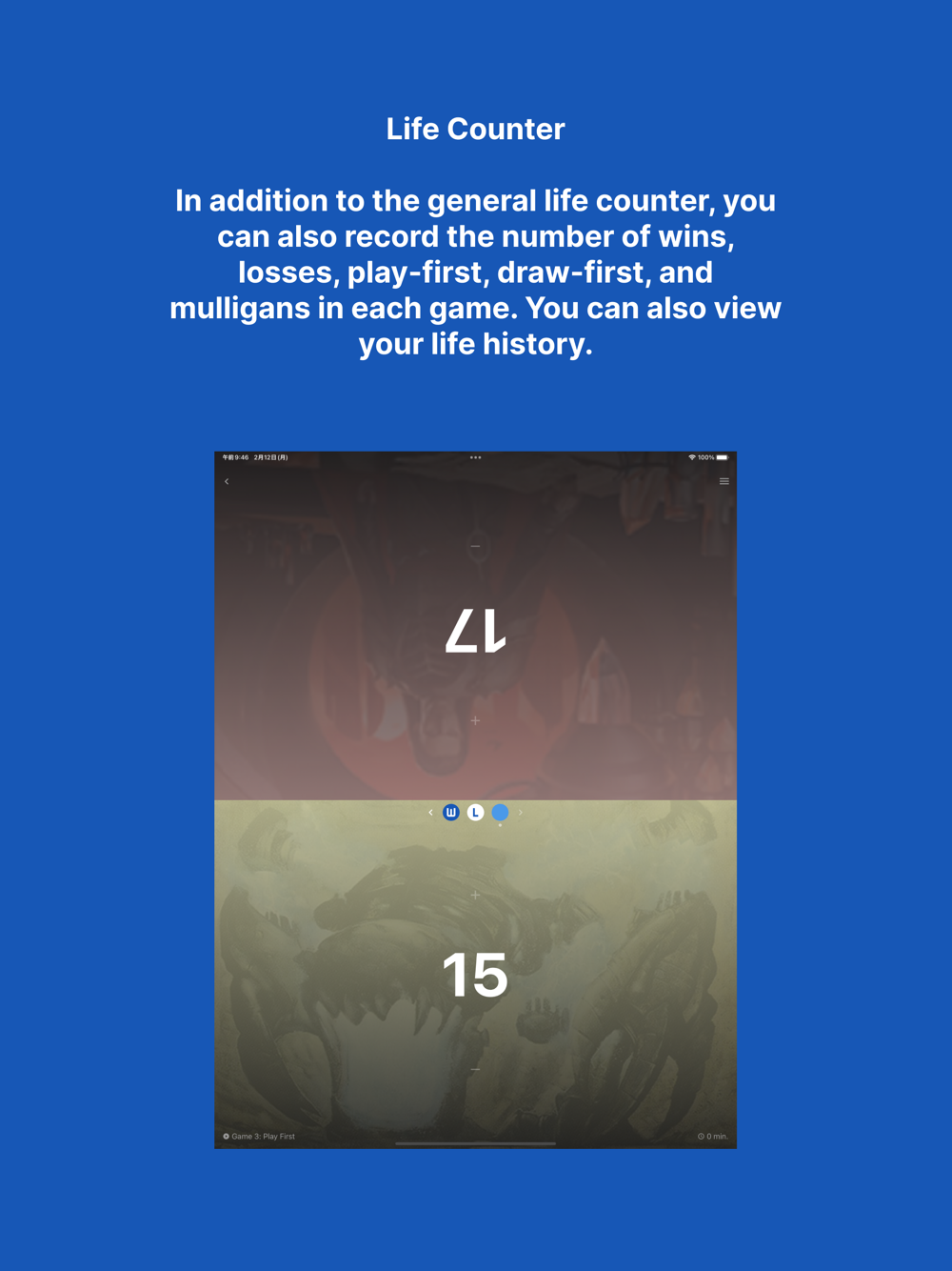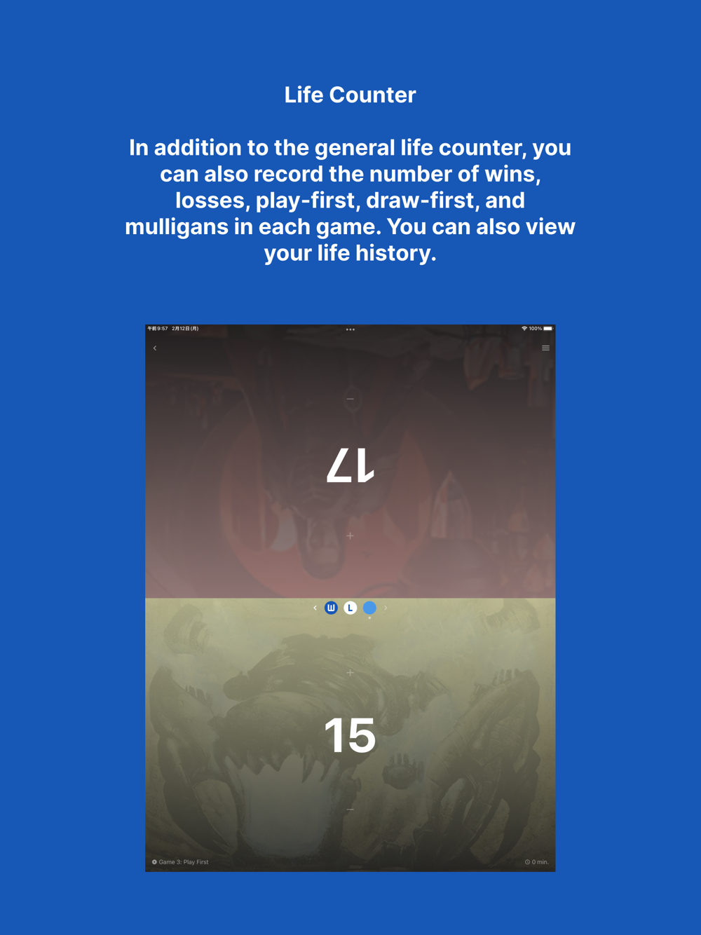 MTG Playbook is an all-in-one app for Magic: The Gathering. Its main features include a life counter, match record, match analysis, deck building, deck solitaire, and detailed card search.