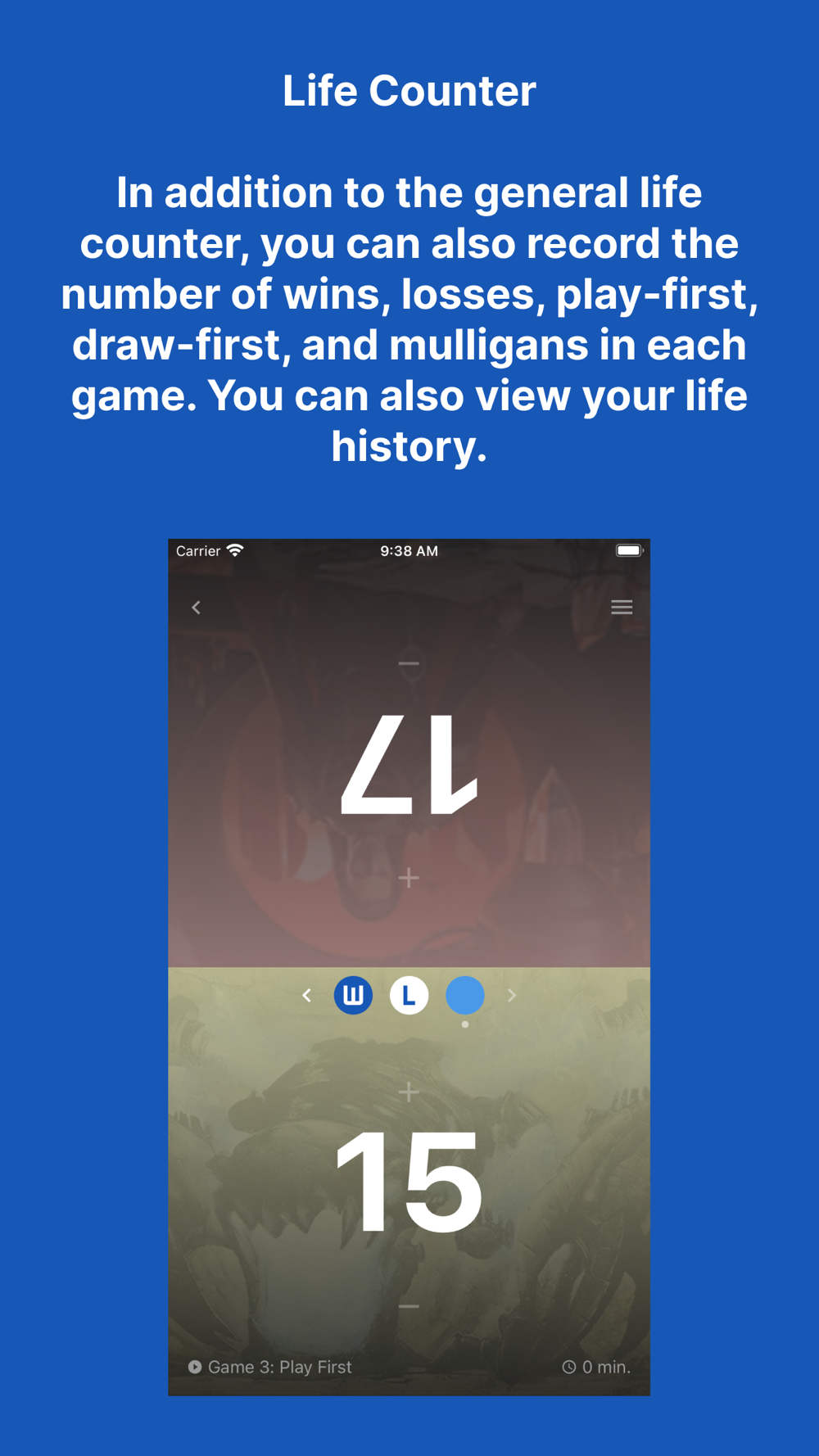 You can increase or decrease life points with a tap. It allows you to view life history, count energy and storm, and more. After finishing the first game, the app records the win/loss and starts the second game. The match result is automatically displayed after winning or losing two games.