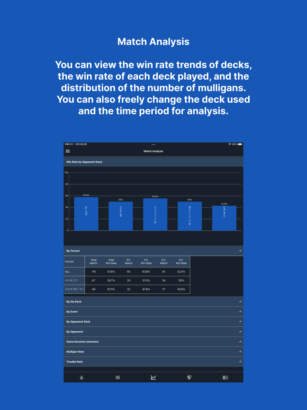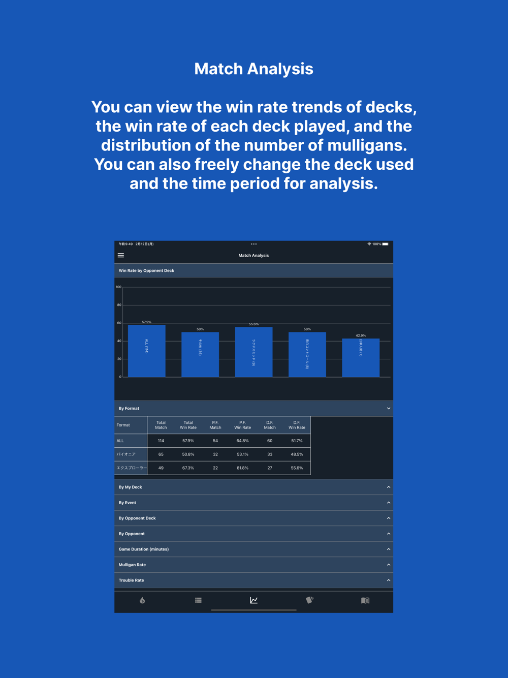 By setting your deck, event, and opponent’s deck in the match record, you can analyze your matches, including win rates and match counts by deck. The default analysis covers the entire period, but you can freely change the period and specify opponent decks or events for analysis. You can also analyze game duration, mulligan counts, mana troubles, and more.