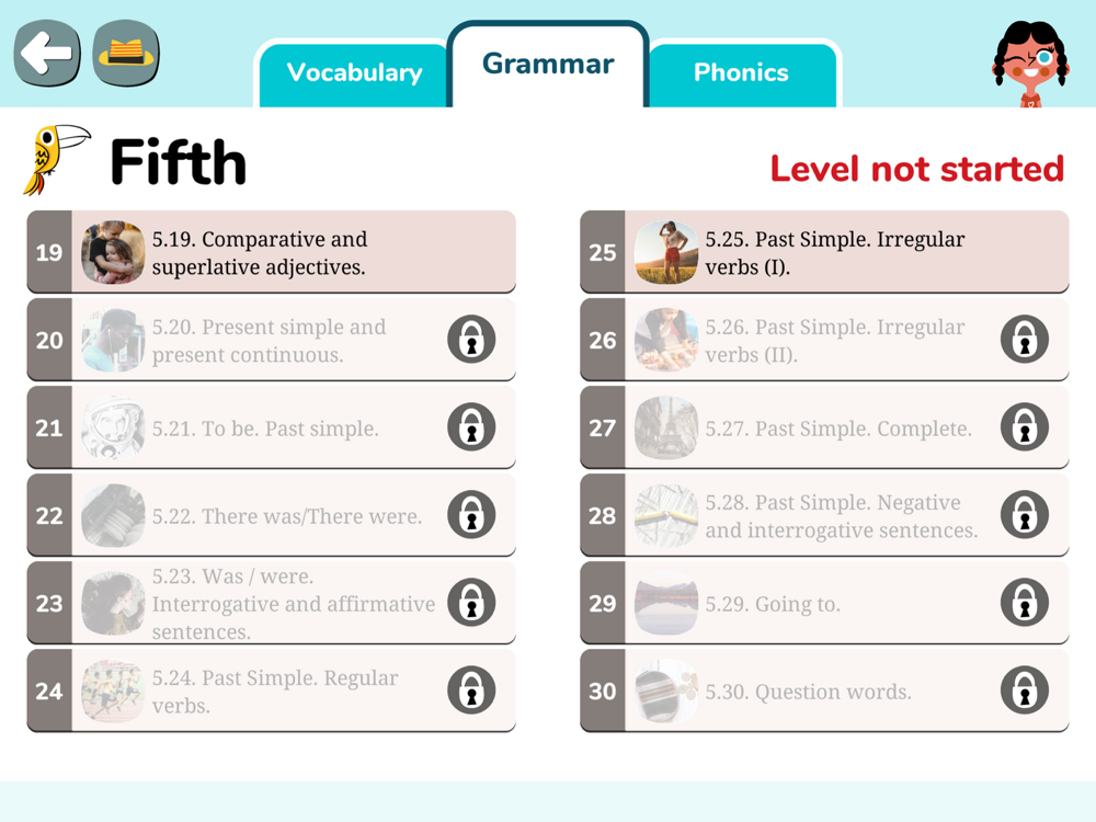 Aplicación para practicar los contenidos del currículum oficial de la asignatura de inglés de Educación Primaria, curso a curso, desde 1.º a 6.º.