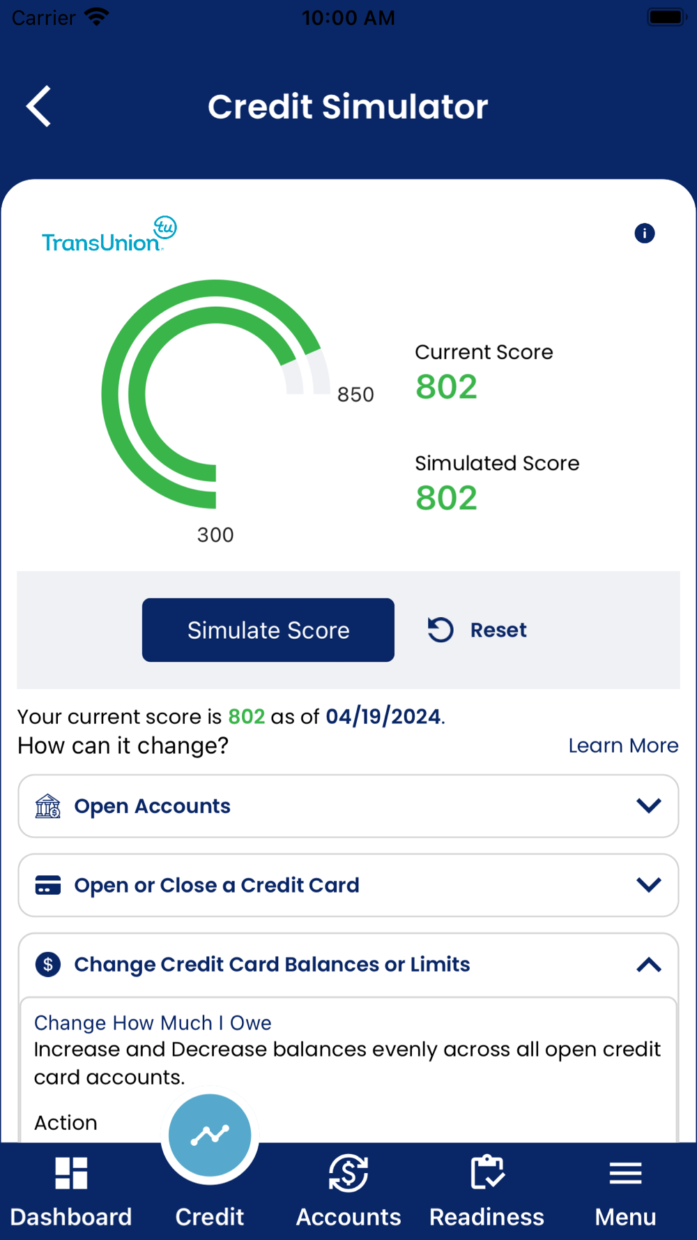 Your credit score is prominently displayed in your dashboard - and it doesn't cost you anything. Track changes month to month and learn the key factors that make up your score like length of credit, timely payment history, utilization of credit, total accounts opened and inquiries. Don't worry, this is a "soft credit pull" meaning there is no impact to your score by checking it. Look through your credit report for accuracy. Access helpful articles that explain credit bureaus, credit score, and more.