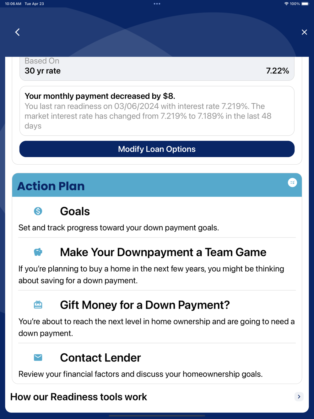 Work with your financial partner or institution to best prepare you for home ownership by planning for a down payment, establishing reserves, managing your debt to income ratio, improving or maintaining your credit, loan scenarios through our calculators, establish your projected loan to value, and more. Visit the readiness assessment in your app to see a snapshot of your credit overview, debt to income ratio, cash reserves, employment, down payment and sales price.