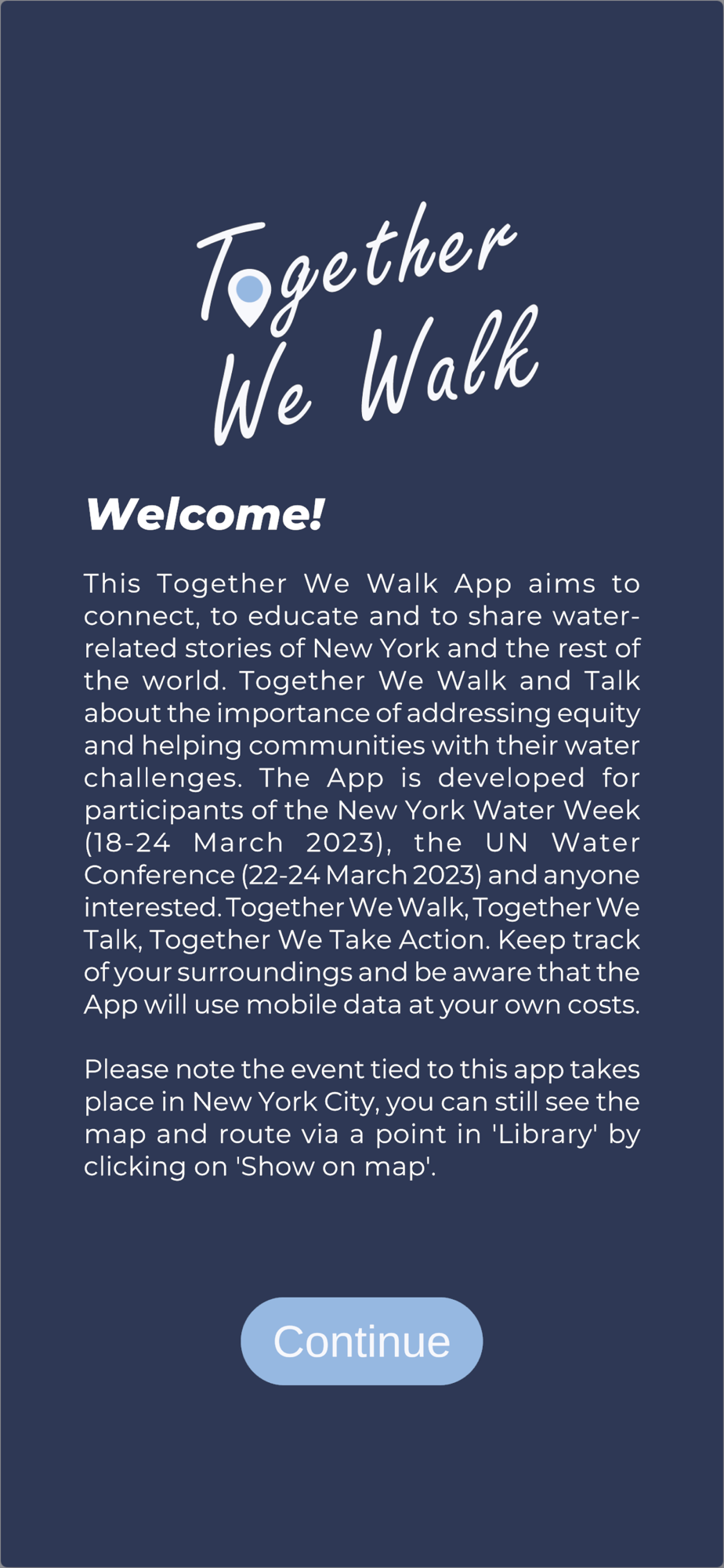 This App has been developed to show sights and insights related to water to participants of the New York Water Week (18-24 March), the UN Water Conference (22-24 March) and other interested people. This App shares a walk with sights containing relevant water stories of New York and the rest of the world. It shows the importance of addressing equity and helping communities with their water challenges. We like to invite you to experience the Water Walk and to activate the discussion on how to accelerate change in the global water crisis.