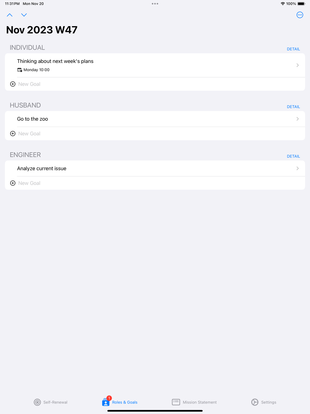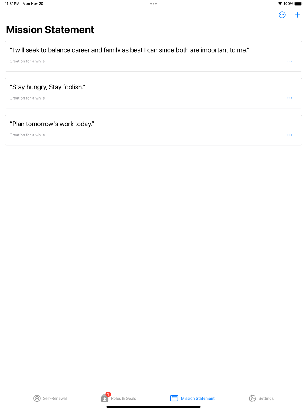 * Rich desktop and lock screen widget support, including: Today's unfinished Self Renewal goals, Self Renewal status for the week, personal mission statement, etc.