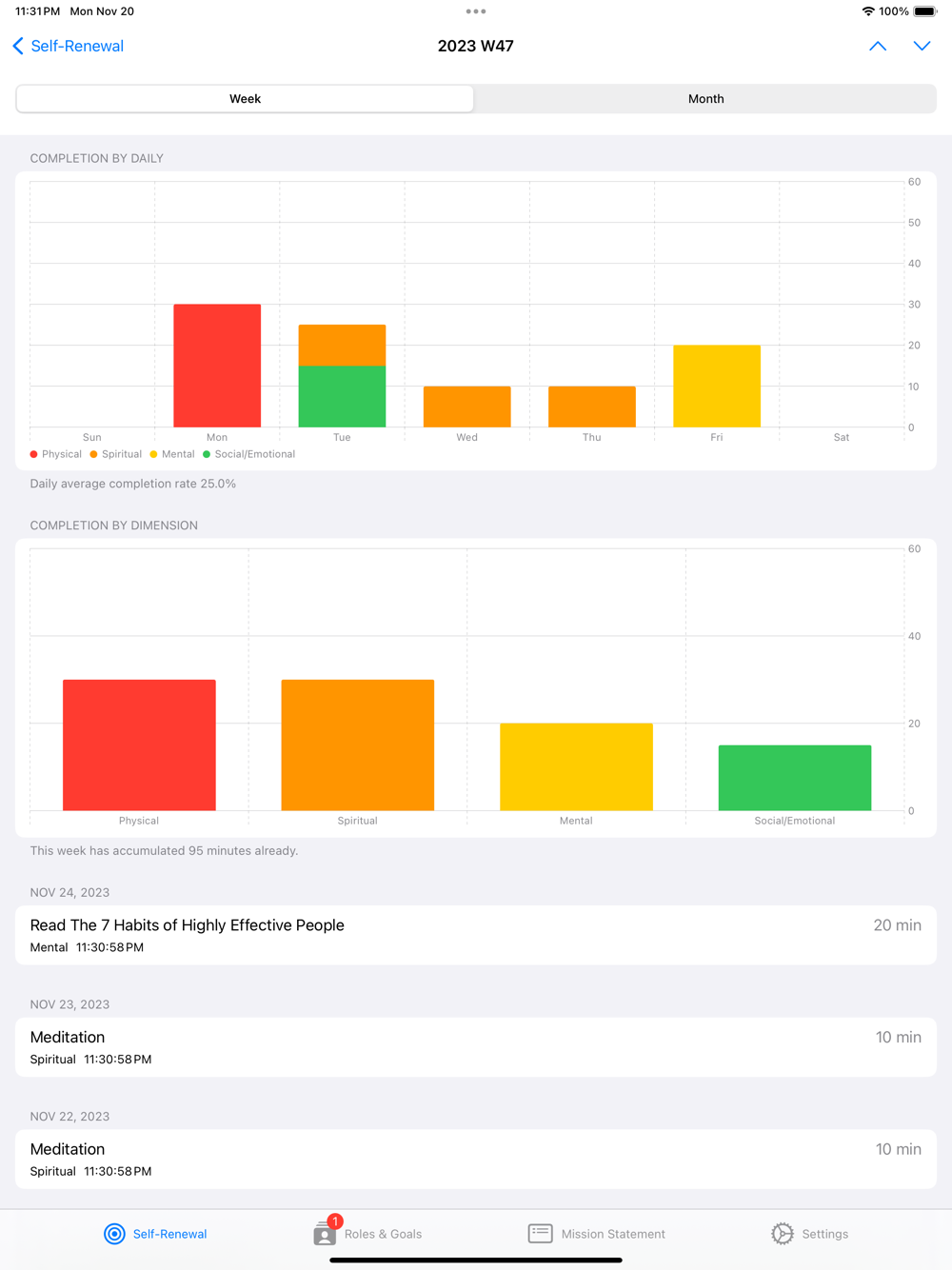 ReHabit is a professional application designed to help you achieve Self Renewal and practice the principles of "First Things First" time management. Inspired by the concepts in "The 7 Habits of Highly Effective People" and "First Things First," ReHabit offers customized features around Self-Renewal, roles and goals, and personal mission statements.